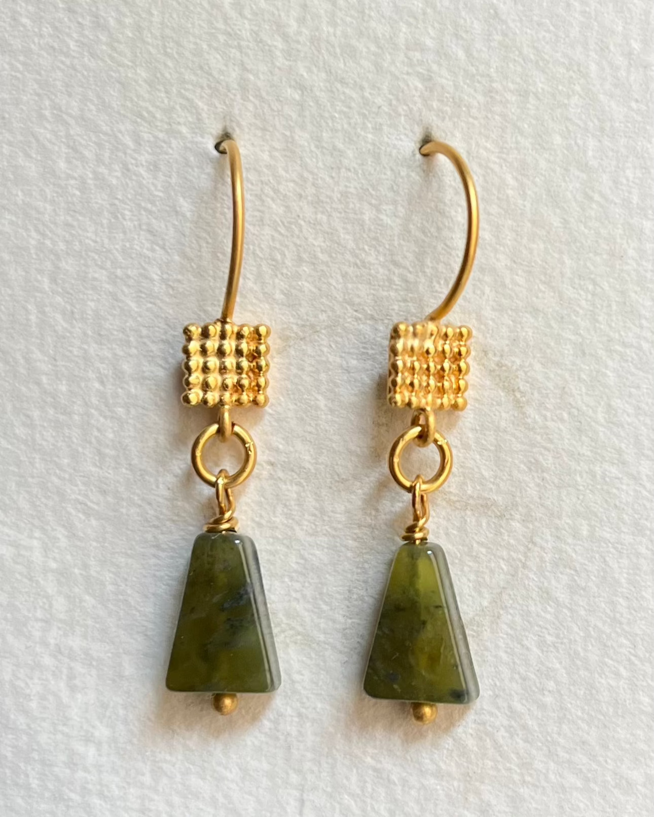 Long Etruscan earrings with hook closure and trapezoid-shaped vesonite , a rare green gem.