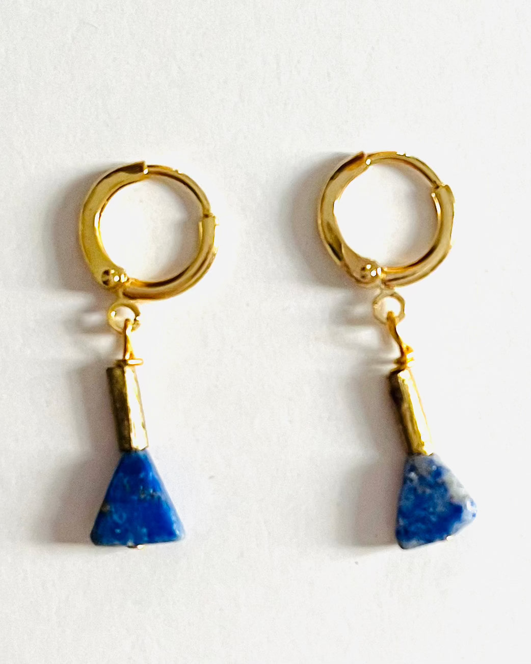 Trapezoid-cut lapis lazuli earrings with a lever-back Creole clasp and gold-plated tubular detail.