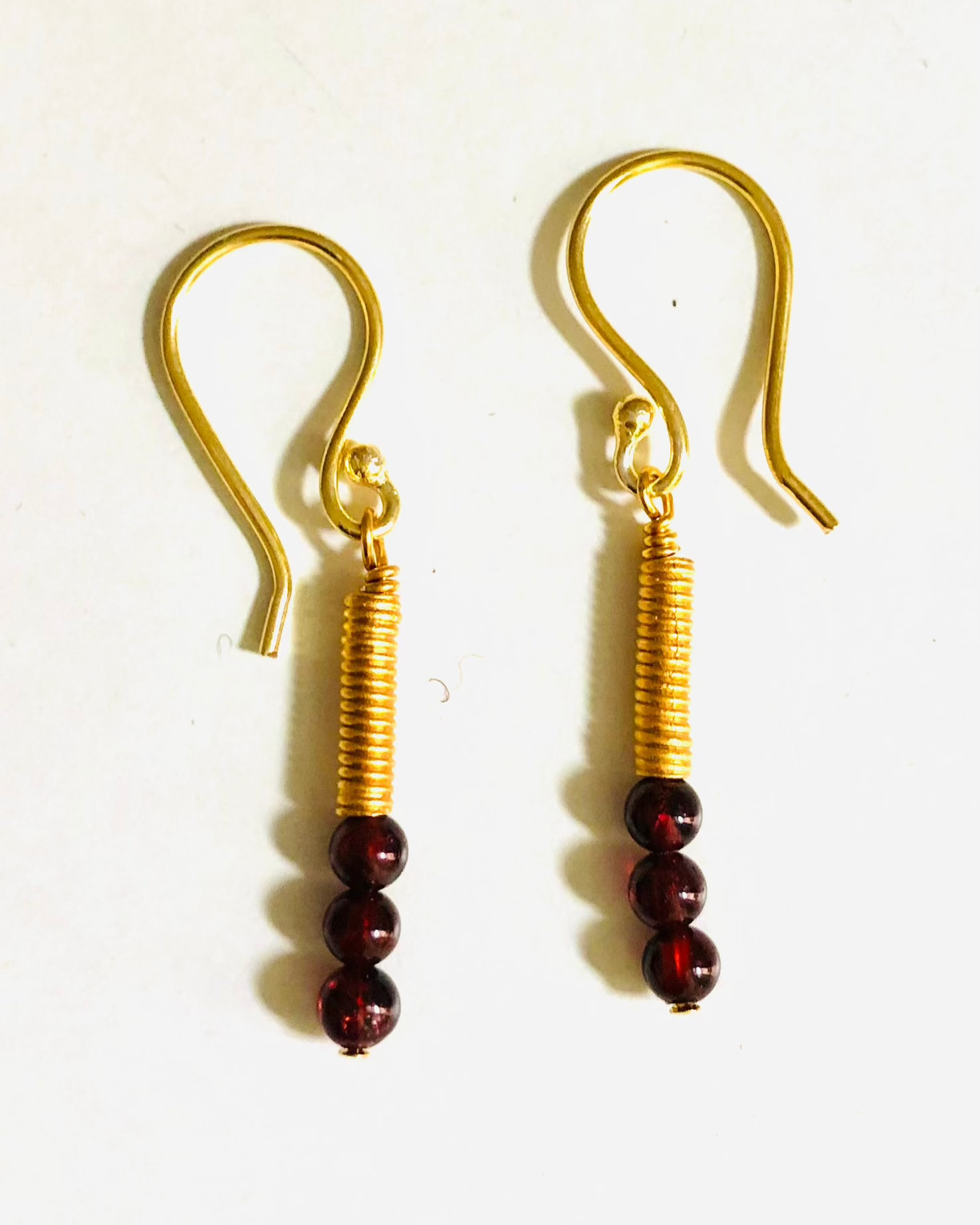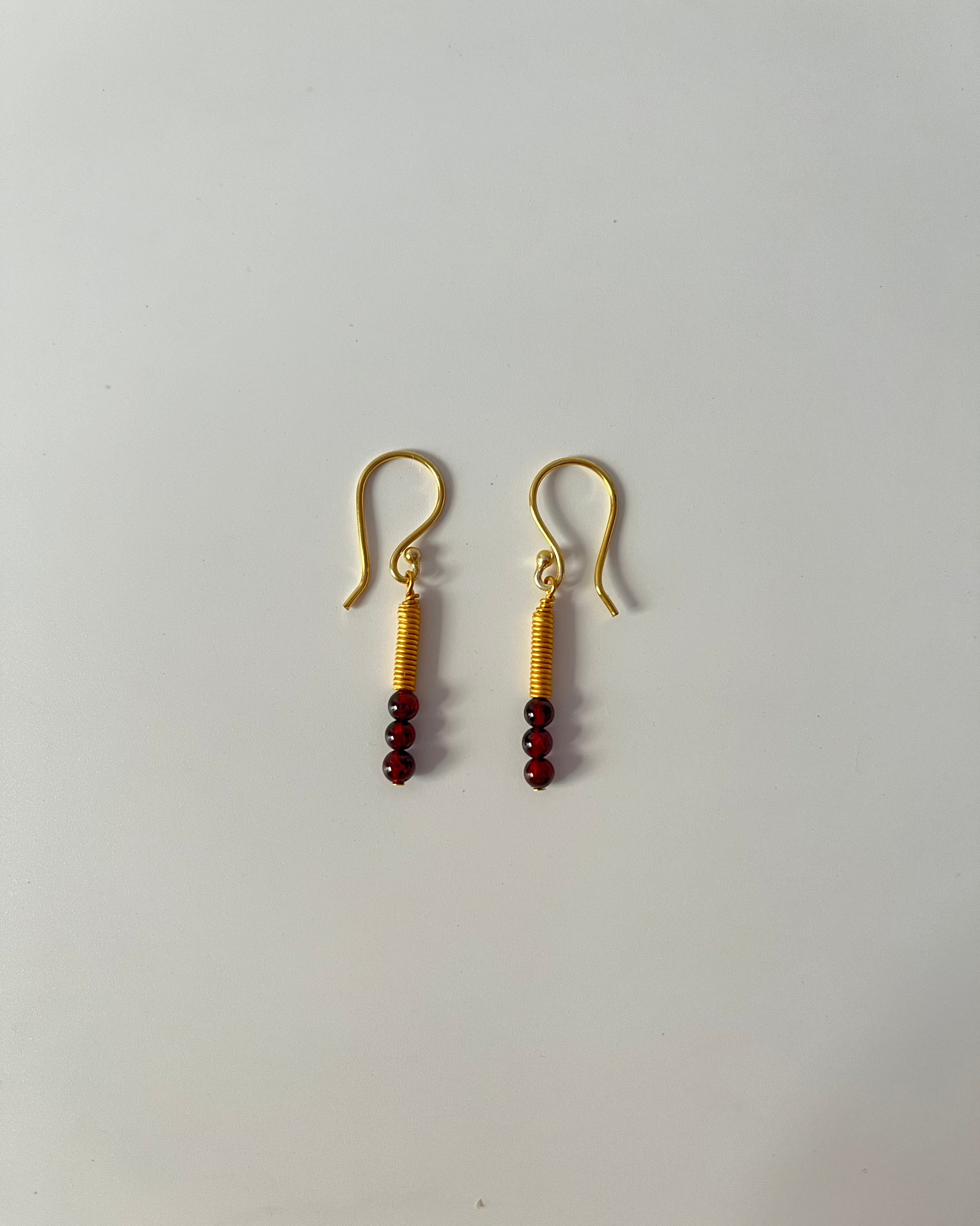 Long, lightweight earrings with hook closures, designed with three garnet beads and a twisted tube that provides balance and visual rhythm.