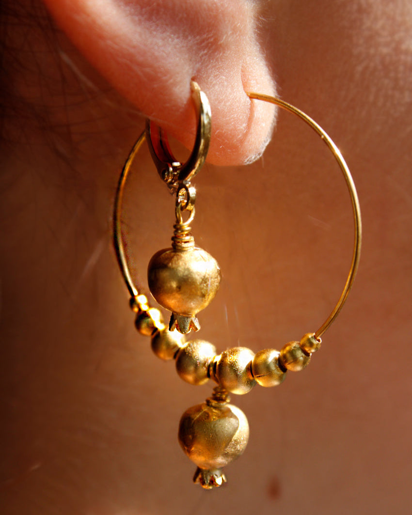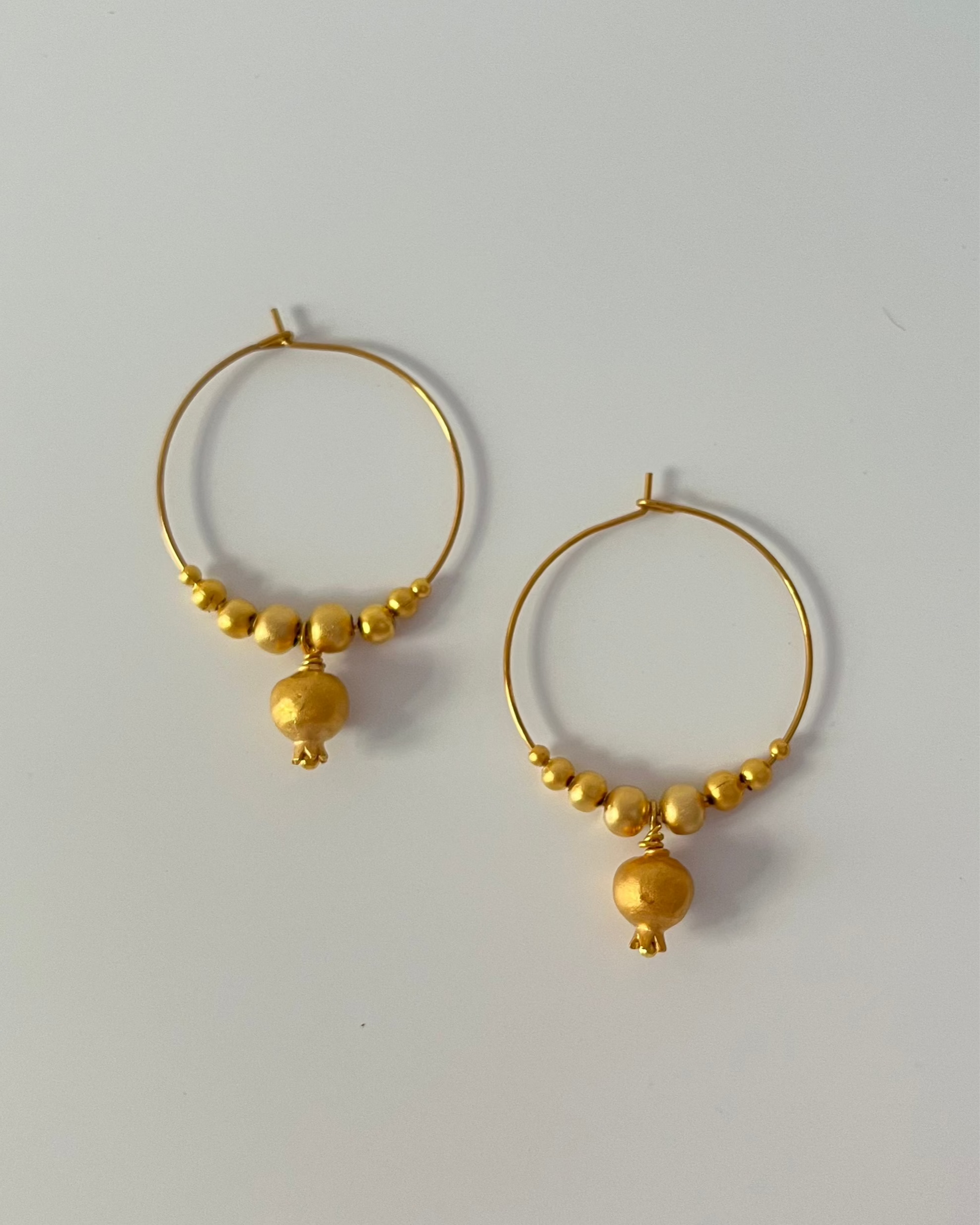 Hoop earrings with a pomegranate pendant in the center and 3 to 4 diminishing beads on each side, creating a balanced and dynamic composition.