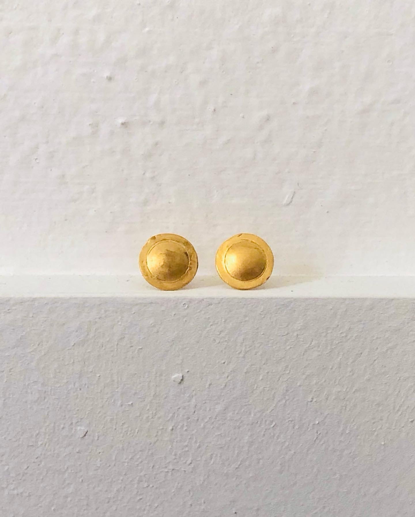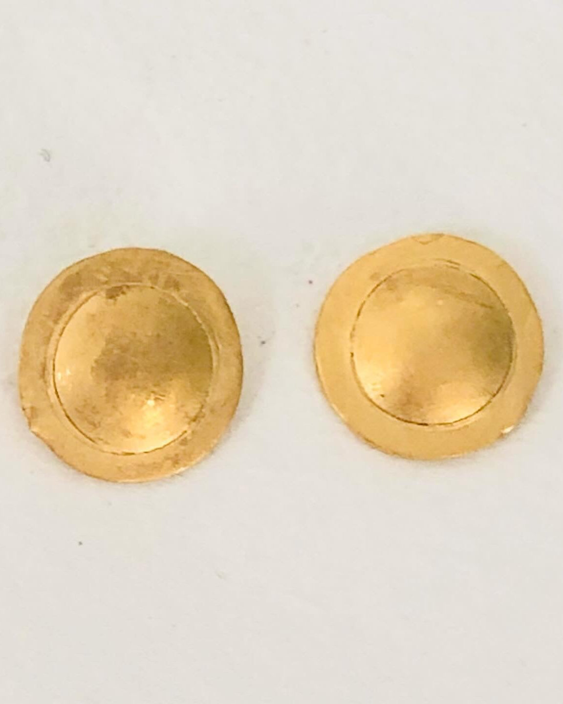 Round, textured earrings with a raised center, flat edges, and a slight irregularity that lends the authenticity of handmade. A simple and discreet design, yet striking, they're sure to be worn forever.