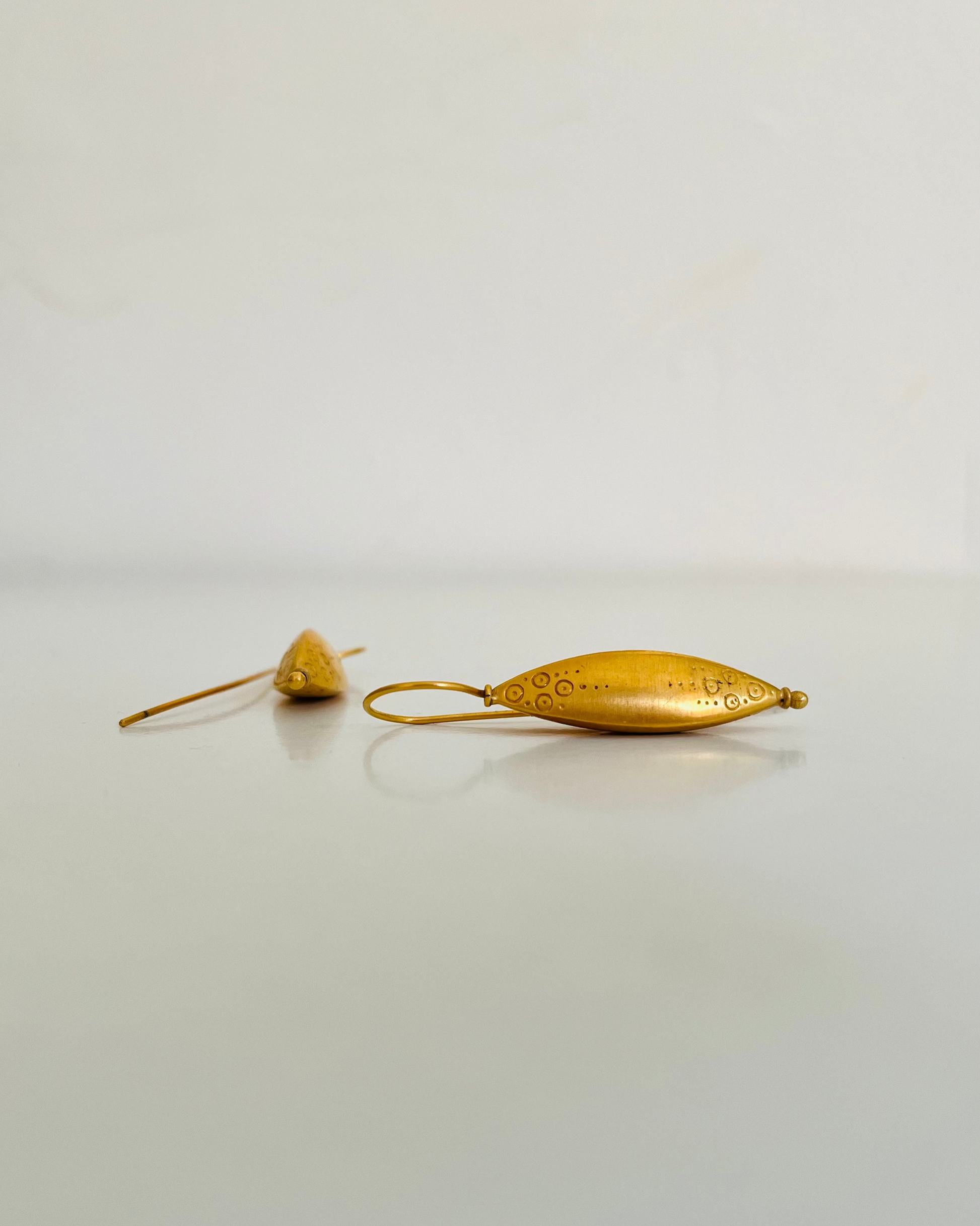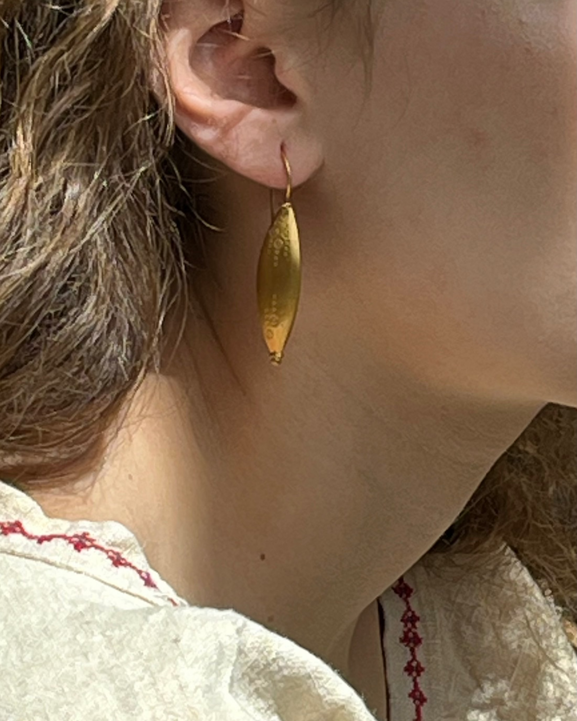 Pendientes Vaina, forma orgánica esbelta y delicadamente grabada, recuerdo evocador del Mediterráneo Antiguo.