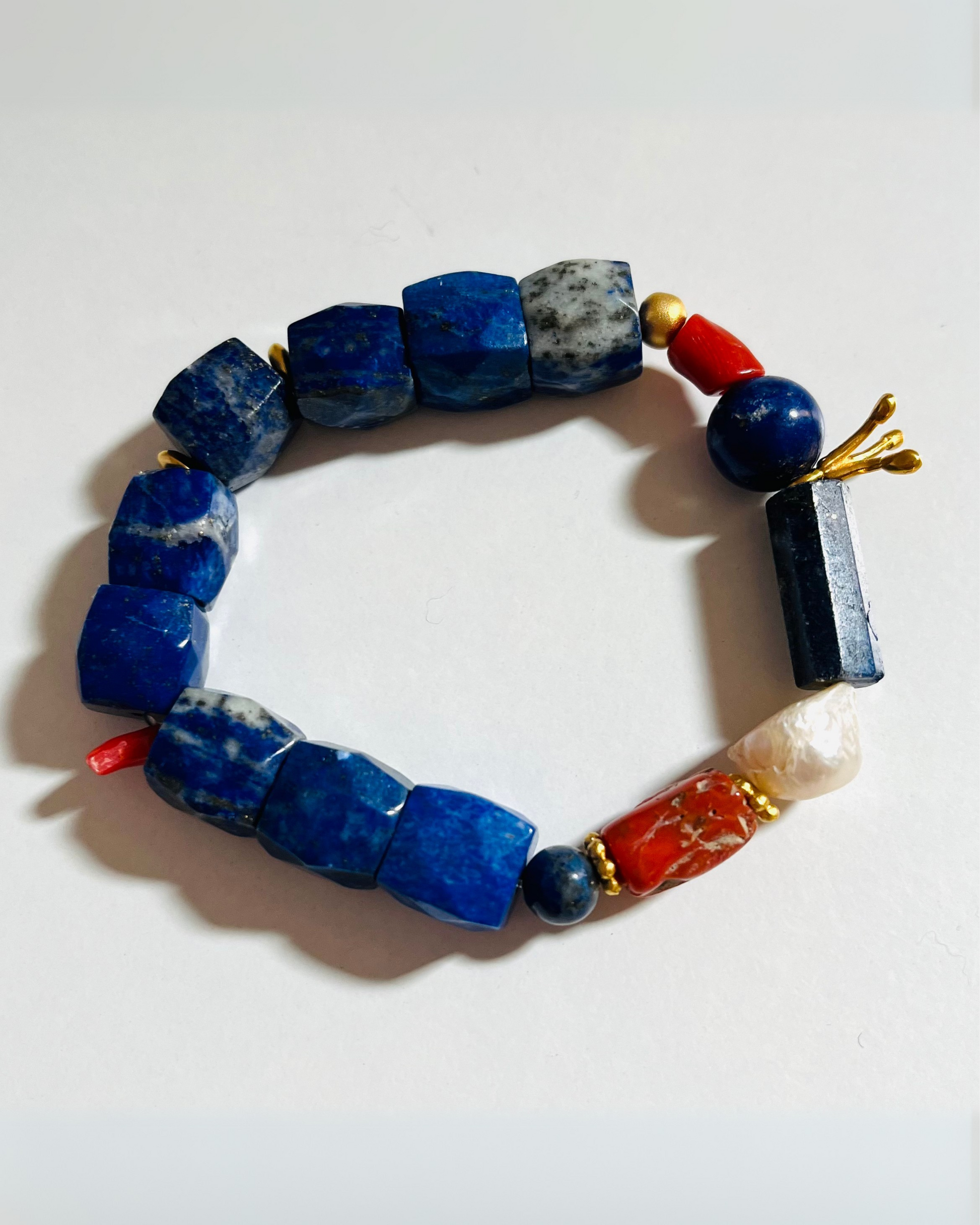 Unique bracelet with lapis lazuli of different sizes , Mediterranean coral , a baroque pearl and the Stamens charm.