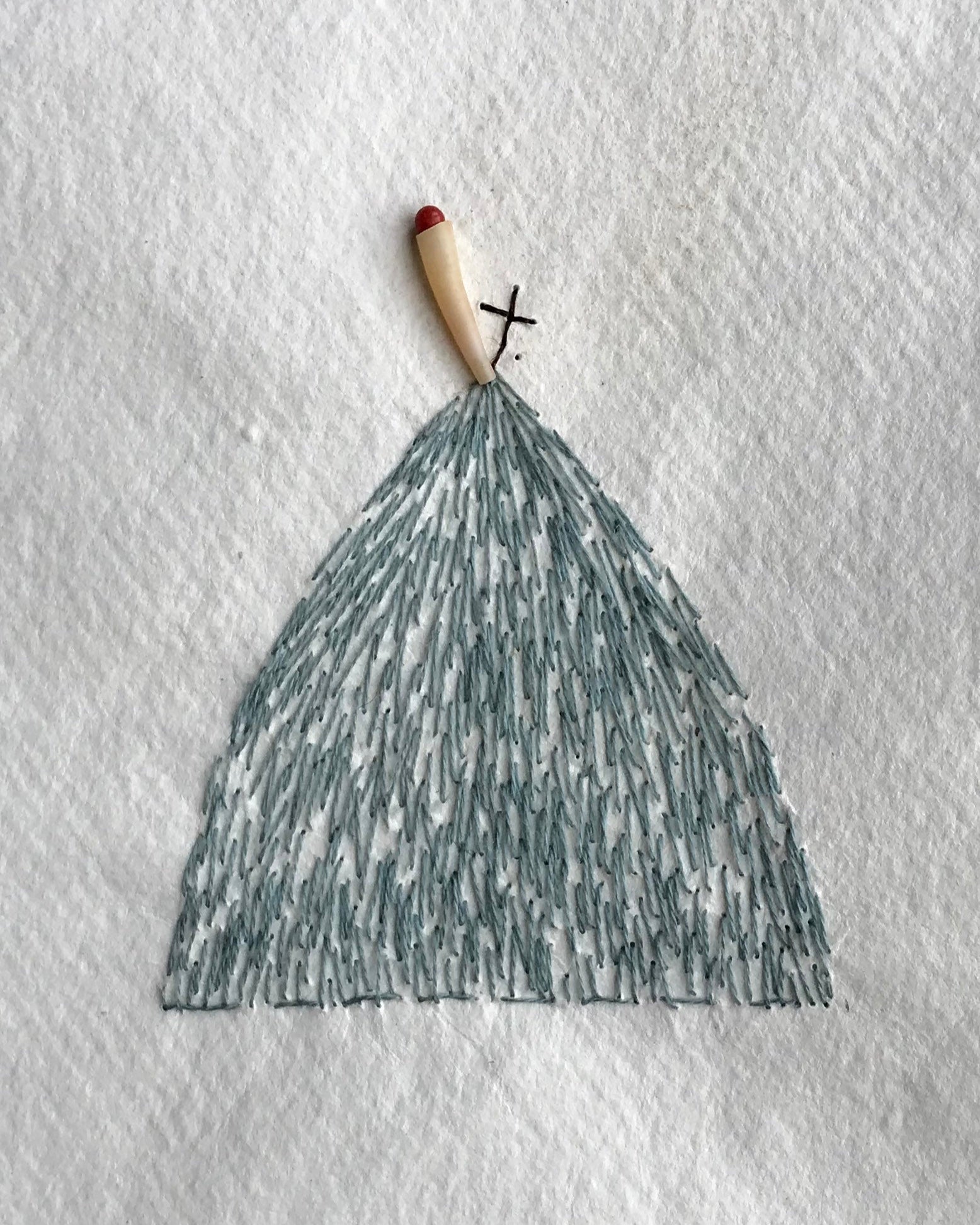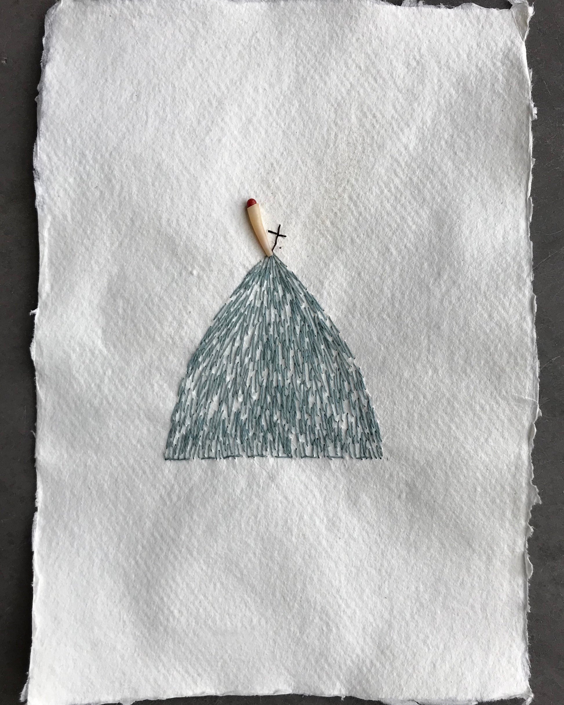 Bordado Casa sobre papel hecho a mano, representando la imagen de algún tipo de habitáculo arcaico ofreciendo protección o para algunos también podría suponer un templo o iglesia.