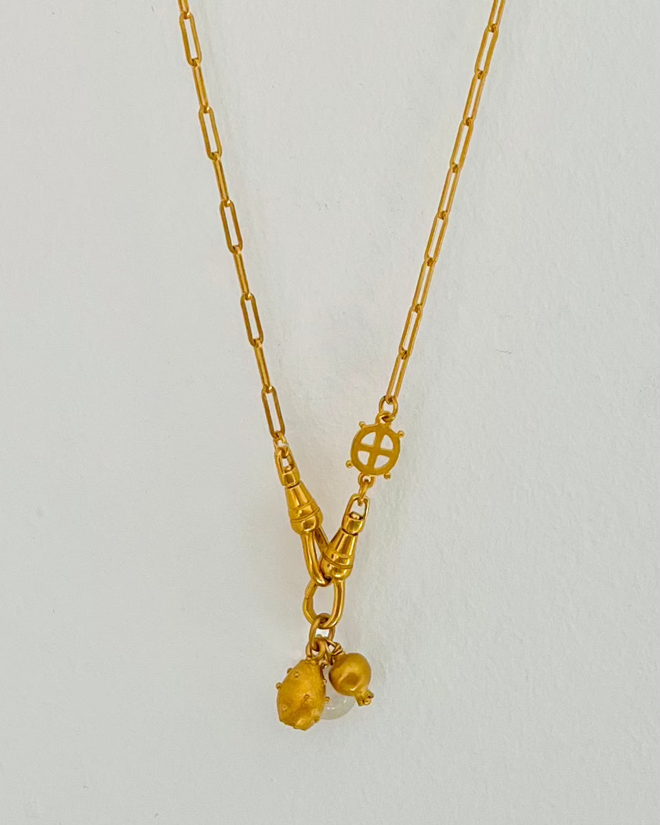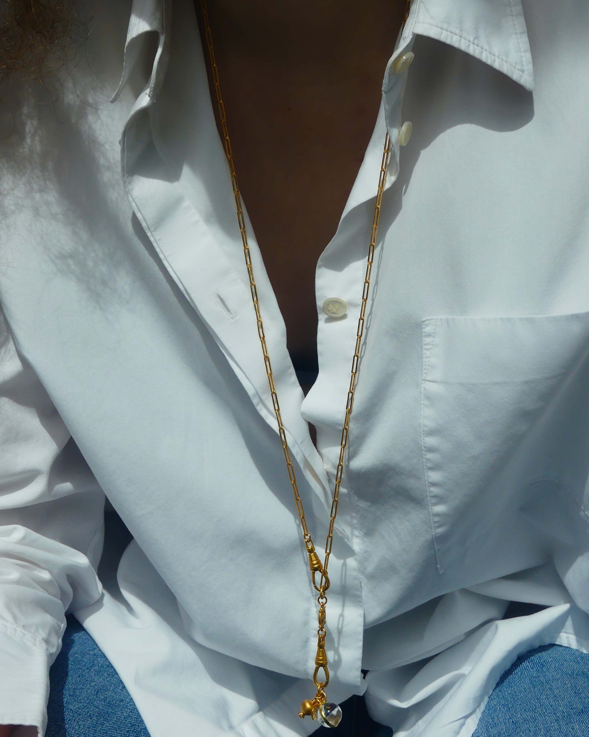 Una pieza especial de El Bazar de Pepa, con doble cierre mosquetón estilo vintage que permite llevarlo de 4 formas distintas. Serie limitada.