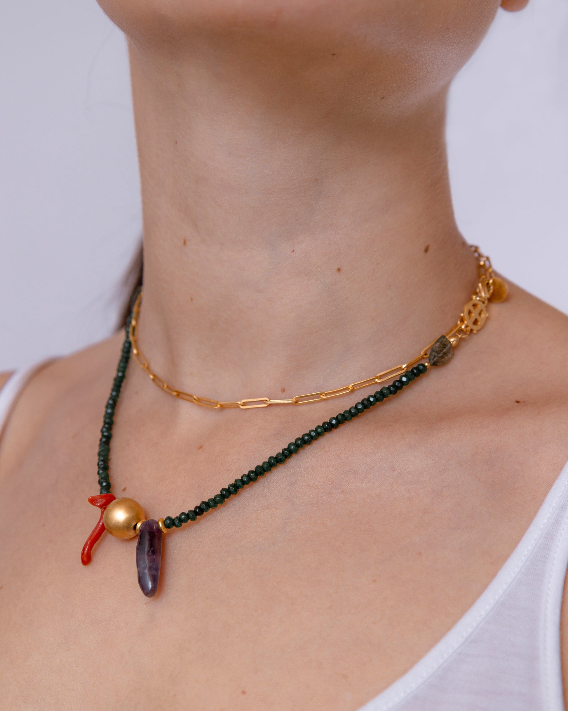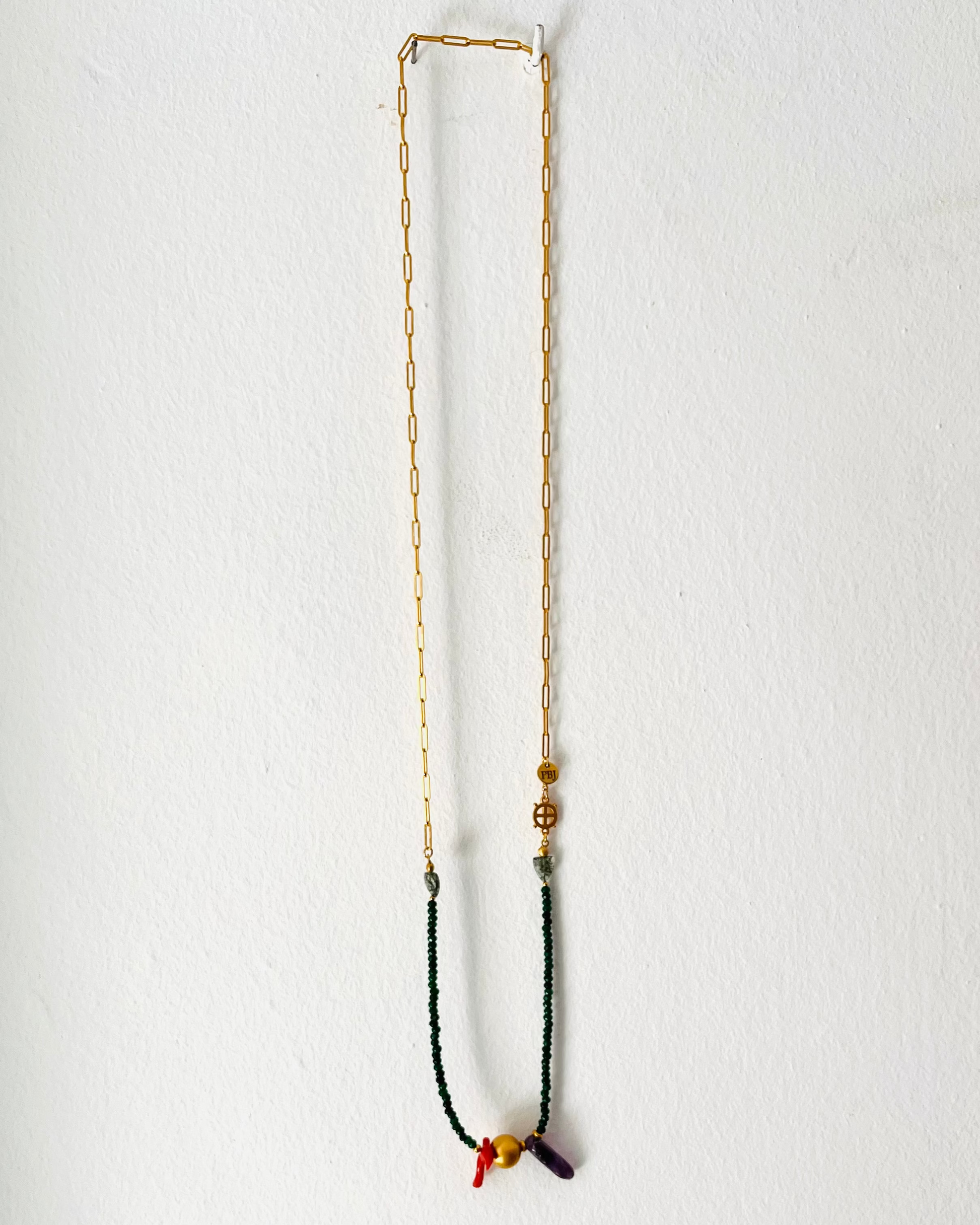 Collar largo con tiras de esmeraldas combinadas con una amatista de hermoso color y una rama de coral rojo mediterráneo. Este collar, como muchos de mis colecciones, evoca formas del pasado sin dejar de ser actual.
