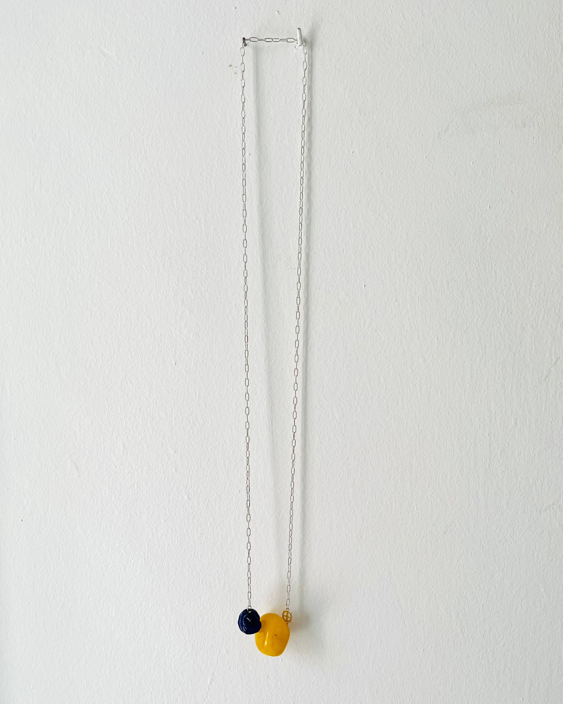 Collar extra largo de plata de ley, con una pieza vintage de auténtico ámbar y una bola de vidrio de Murano azul gallonado. Permite dar dos vueltas colocando el logo en gargantilla.