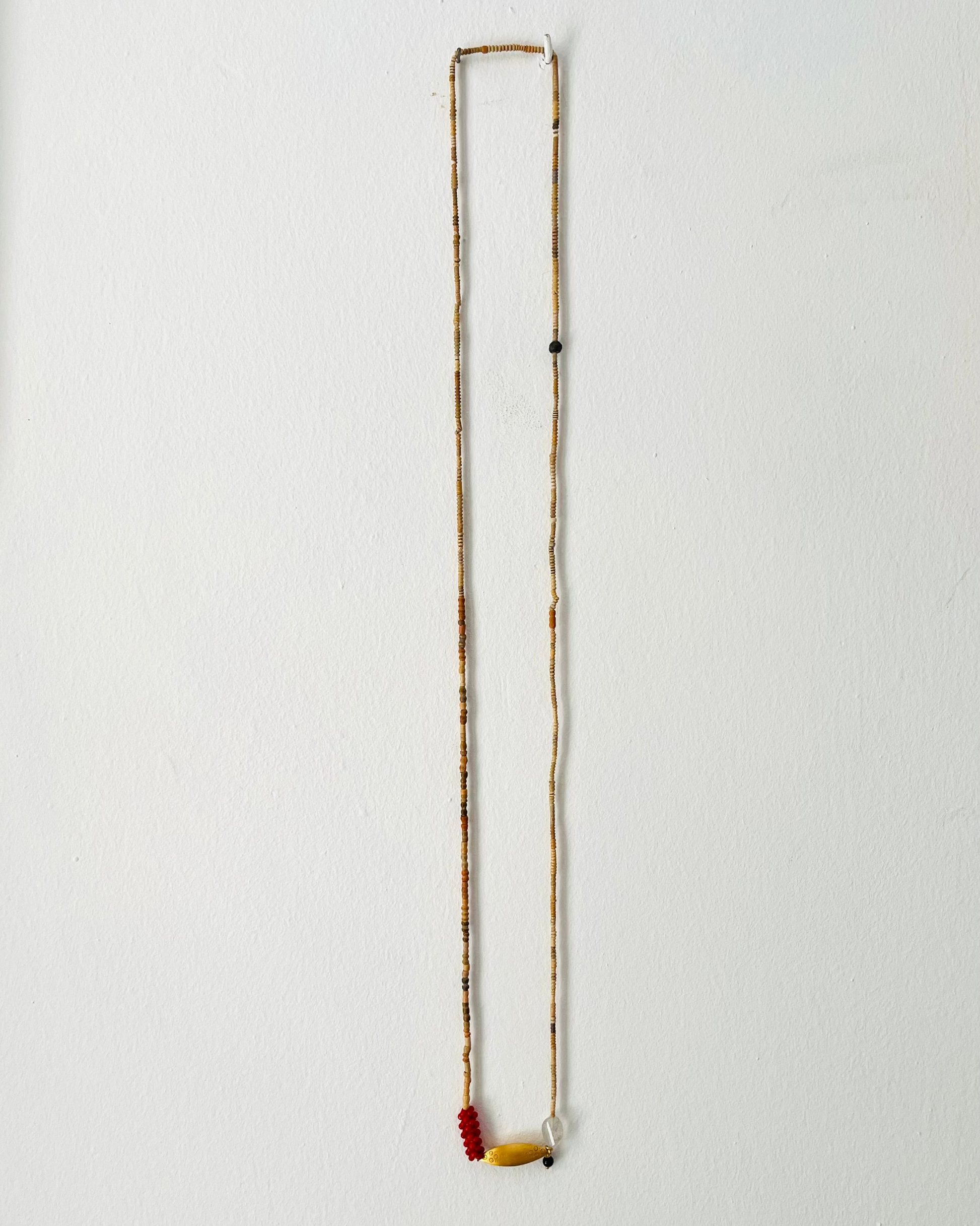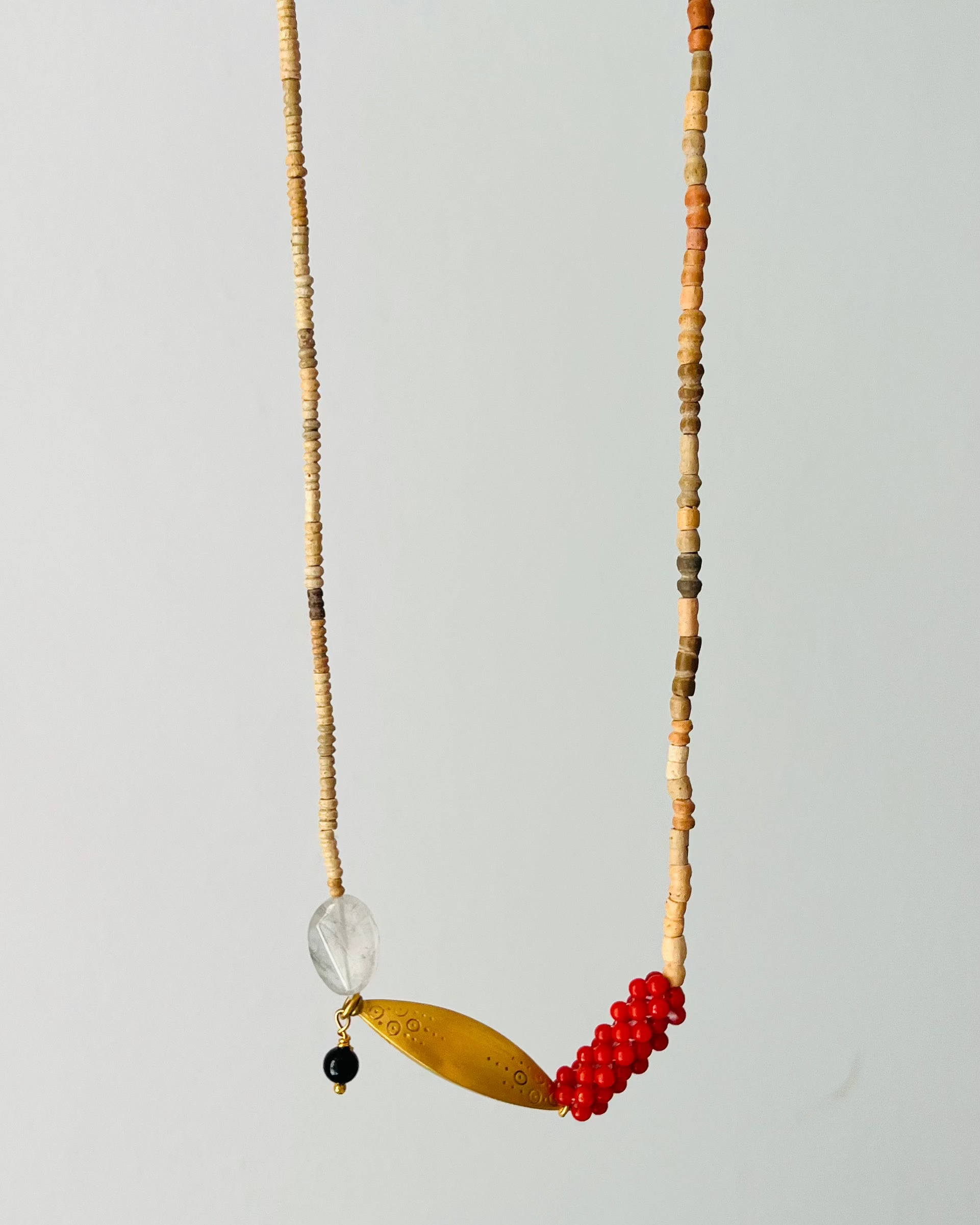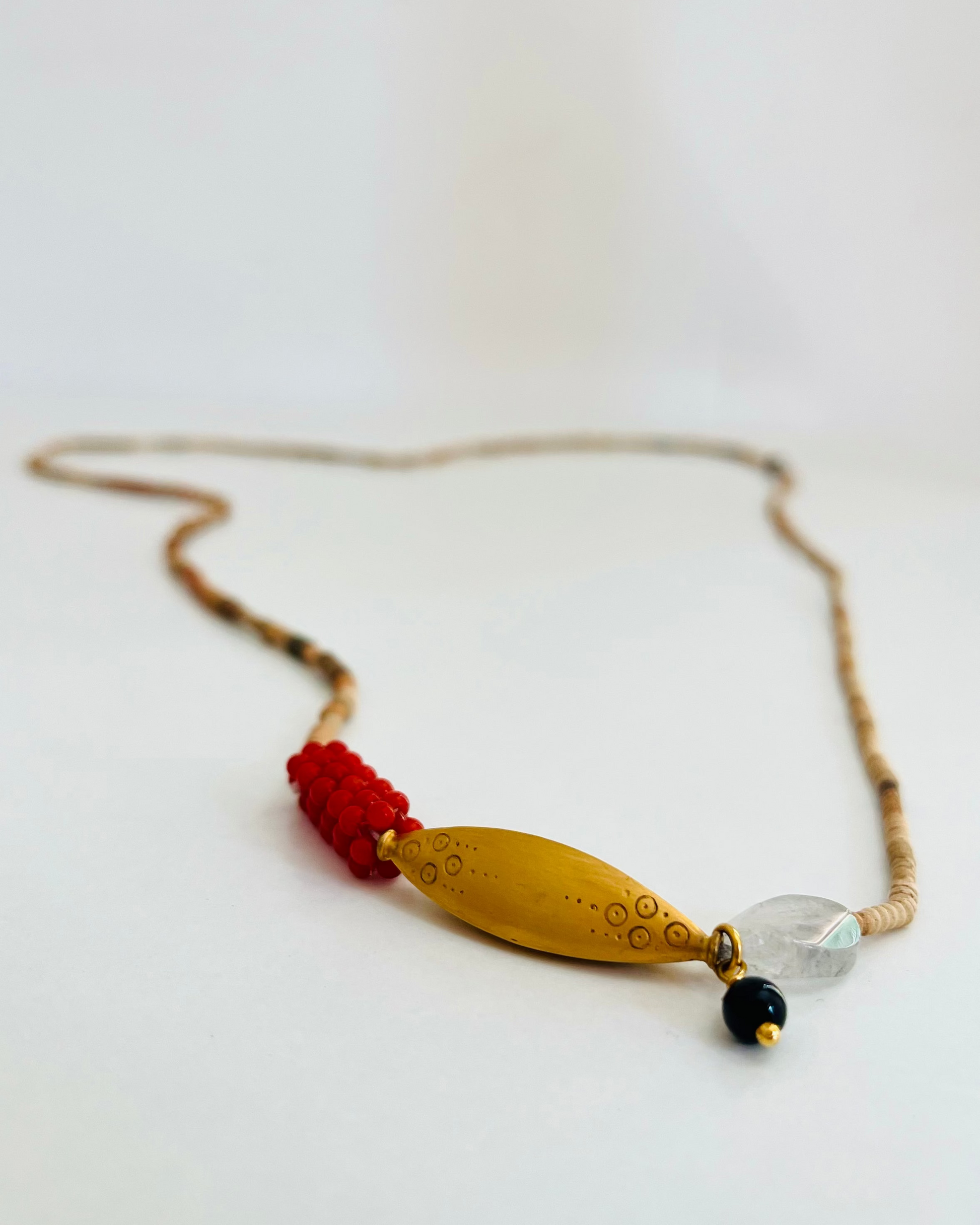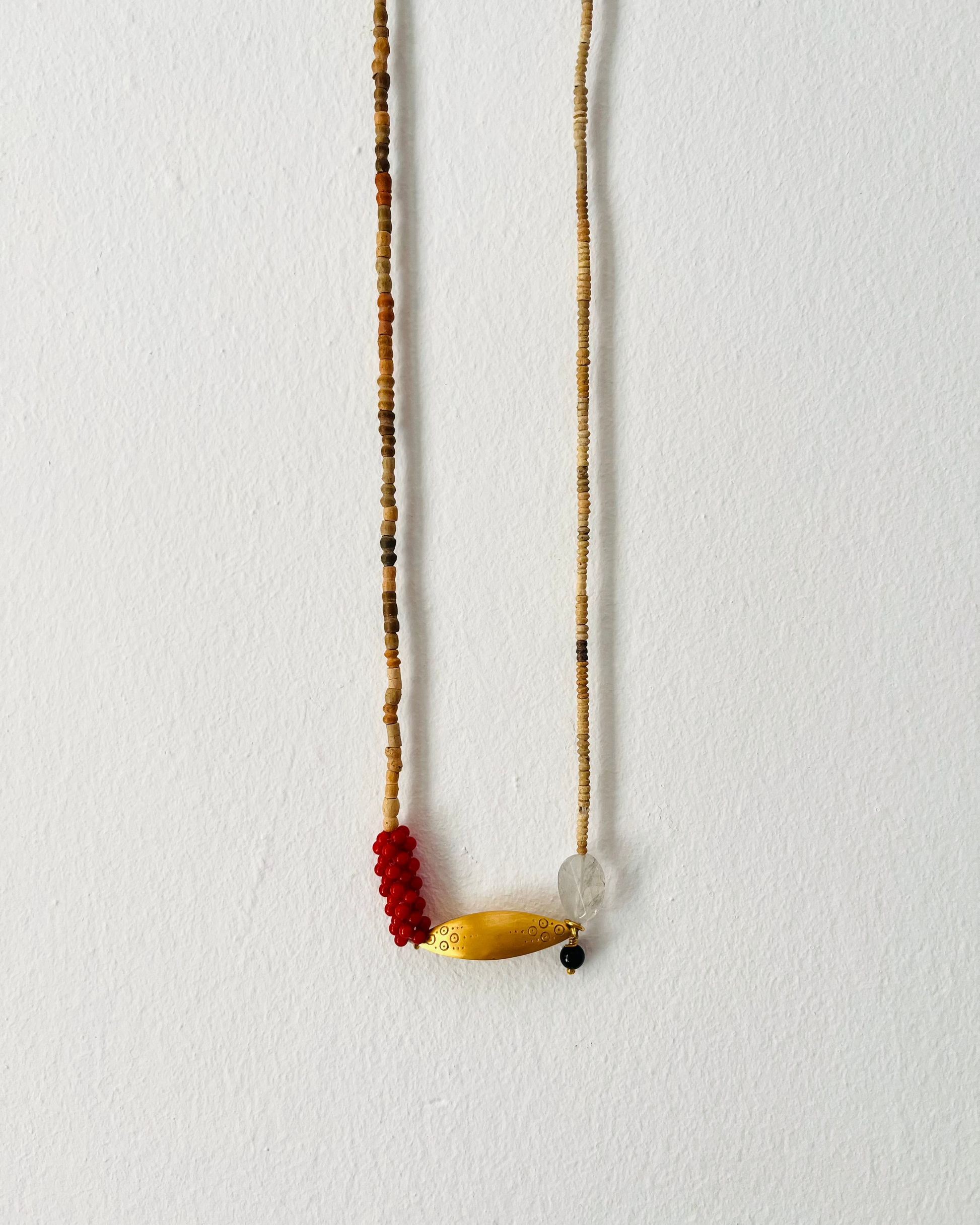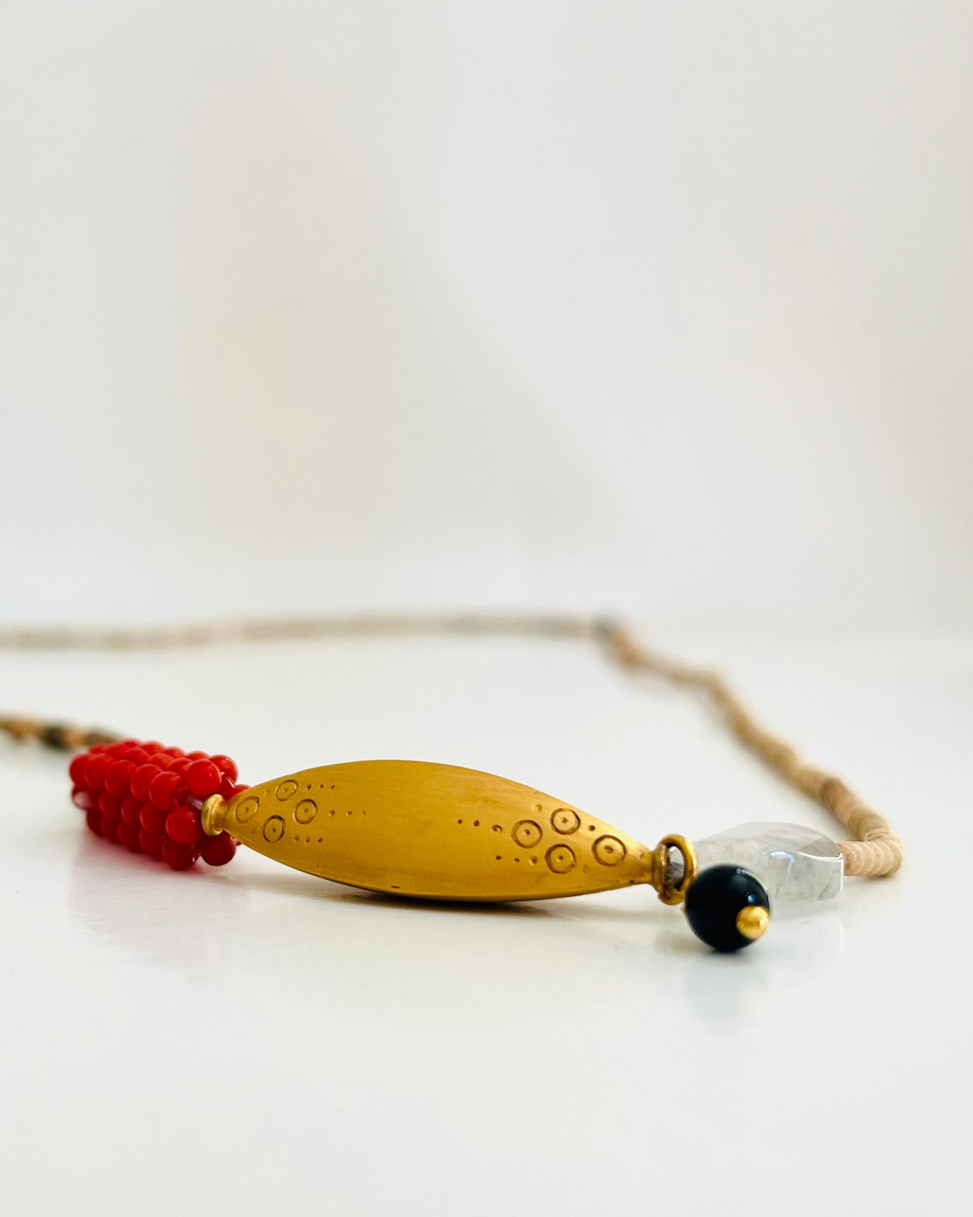 Descubre la belleza artesanal de este collar extralargo único, elaborado con delicadas cuentas de arcilla fabricadas a mano por expertos artesanos procedentes de una cooperativa de Ghana. Combinado con Vaina, uno de mis amuletos, bolas de coral rojo formando un tubo, bola de ónice y una cuenta de cuarzo gris.