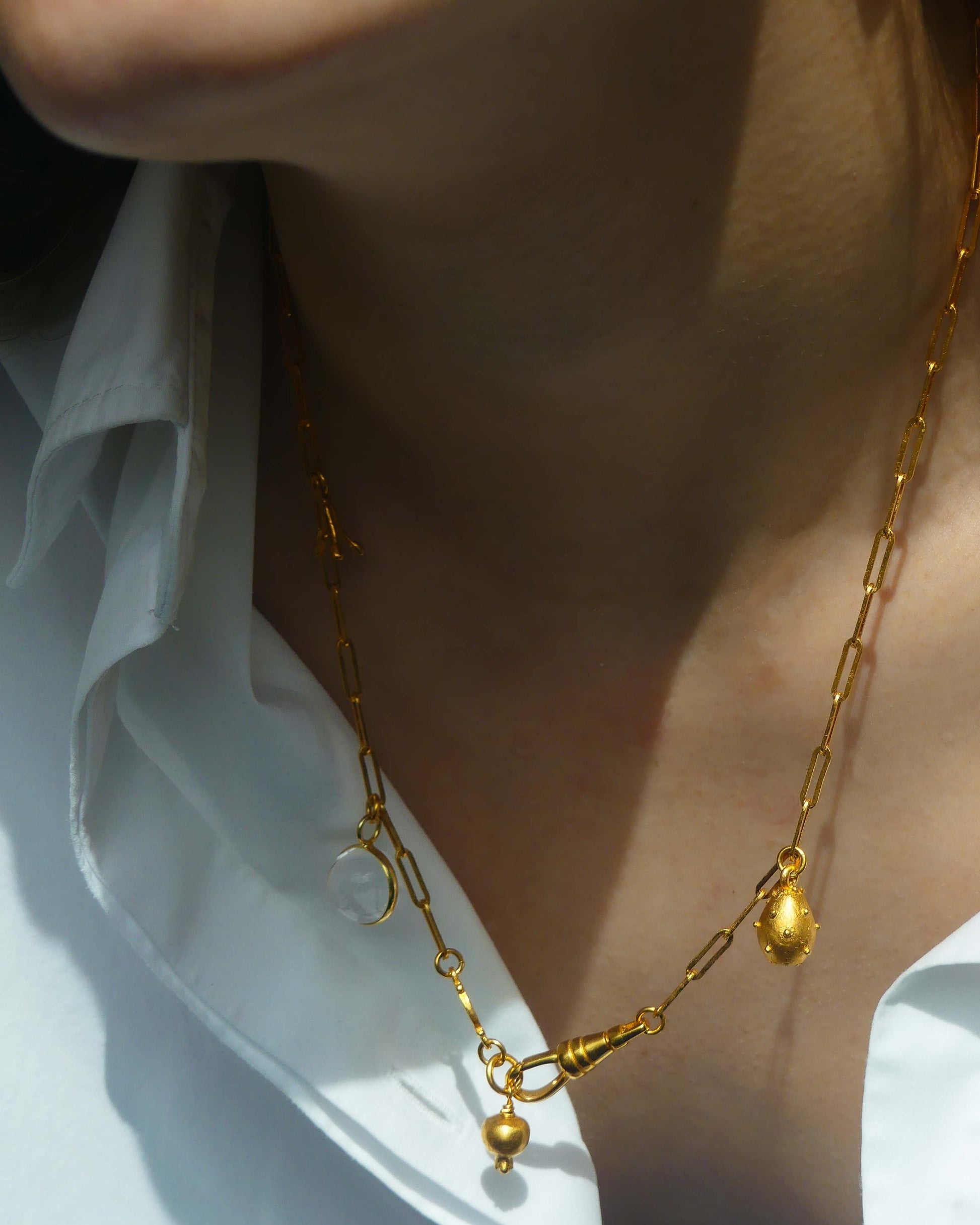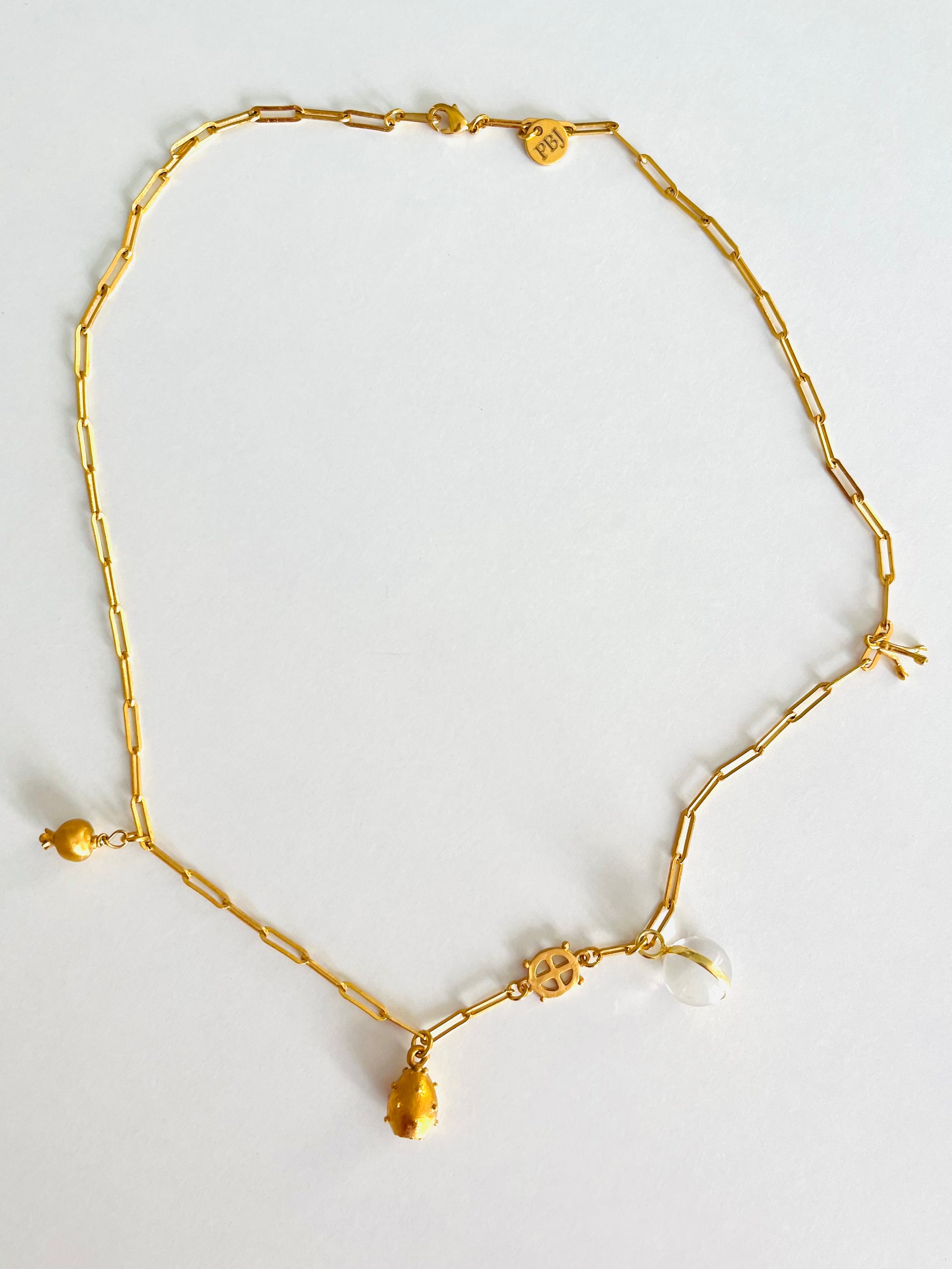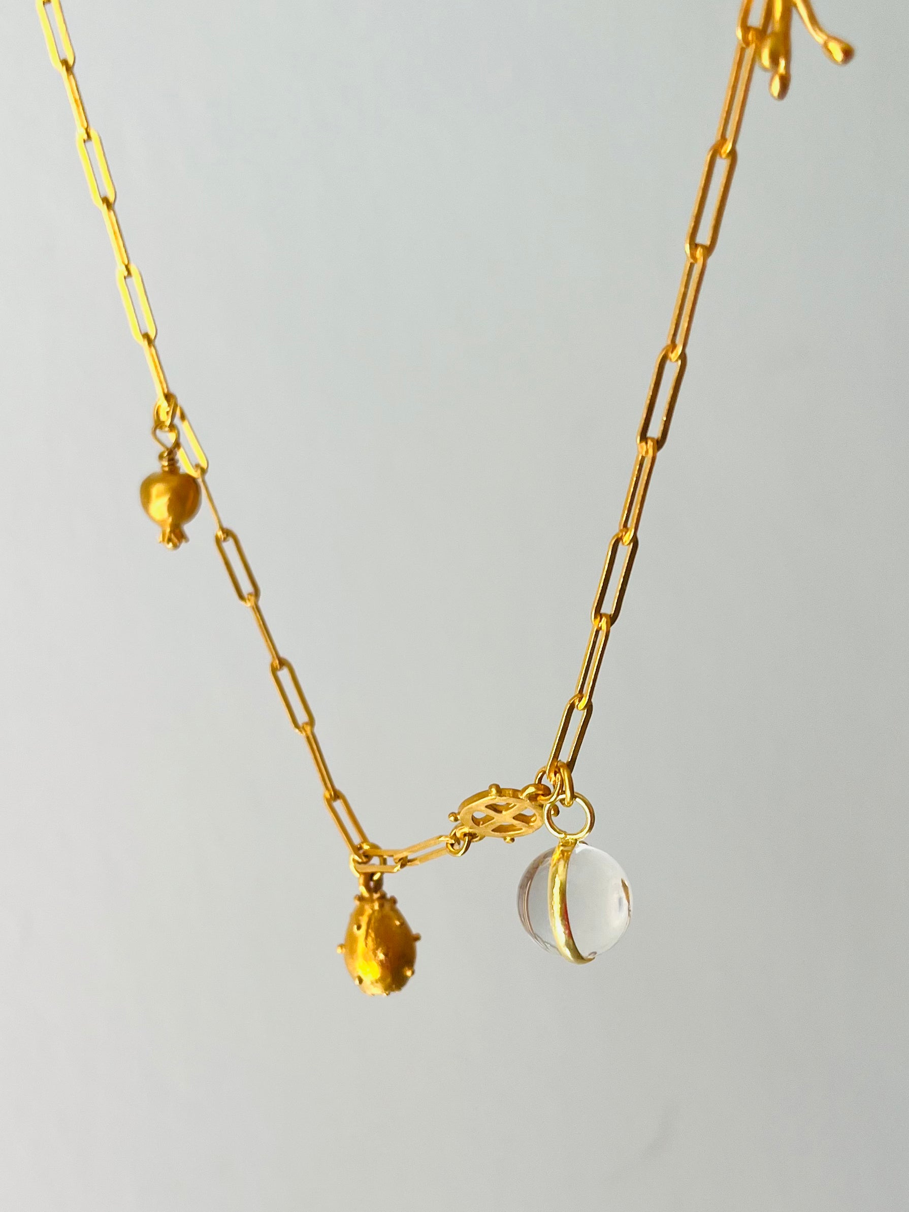 Collar de cadena de eslabón largo con cuatro charms amuleto: bola de cristal de roca, granada, figa de moro, estambres y el logo de la marca.