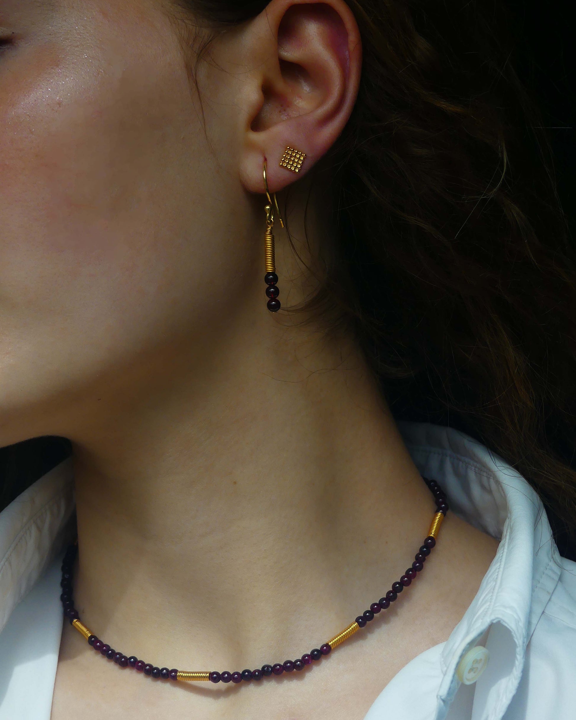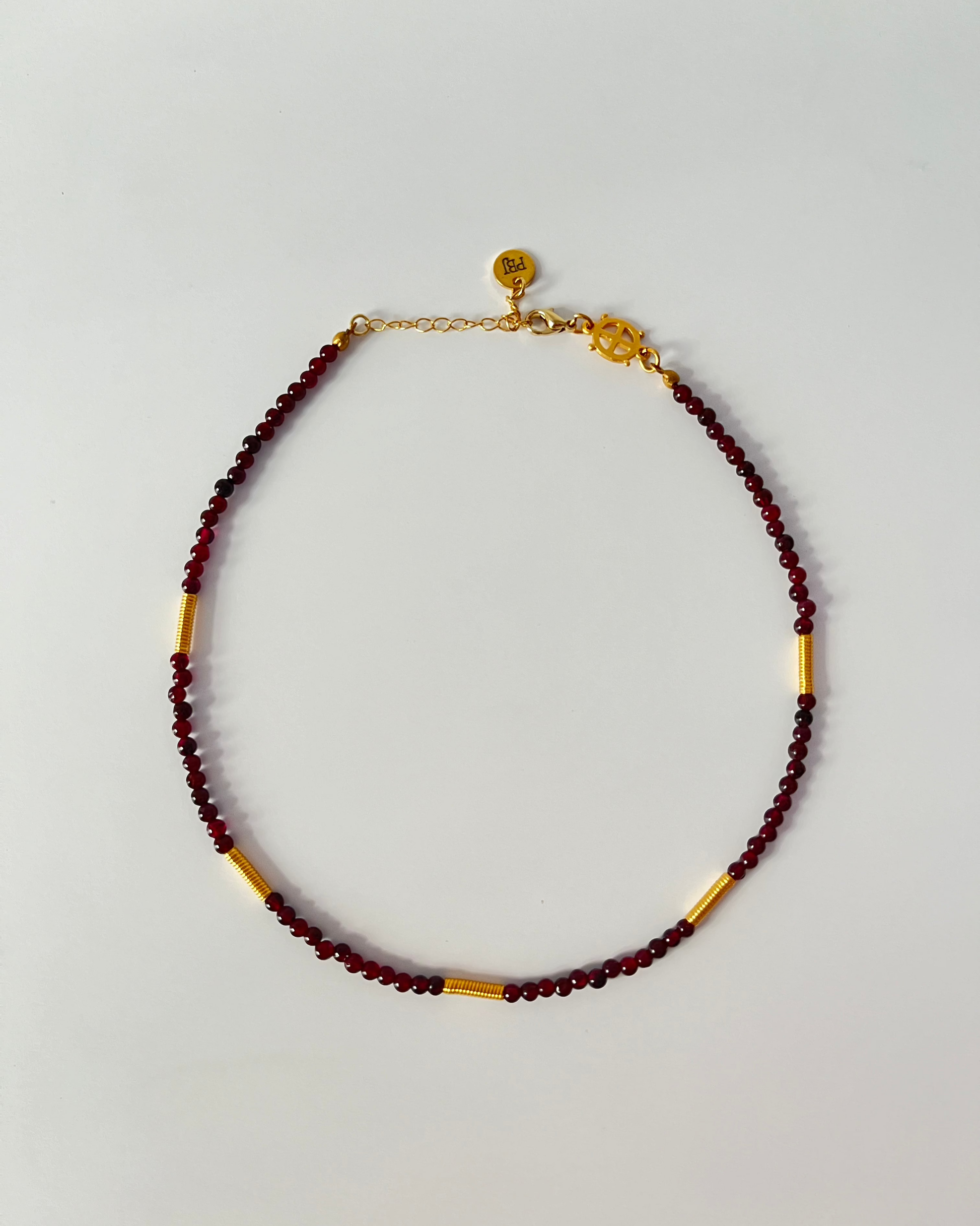 Collar tipo gargantilla con bolitas de granate natural y cinco tubos en espiral intercalados, creando un ritmo visual que nos recuerda a algún collar descubierto en algún rincón del Mediterráneo, como podría ser ...Esmirna.