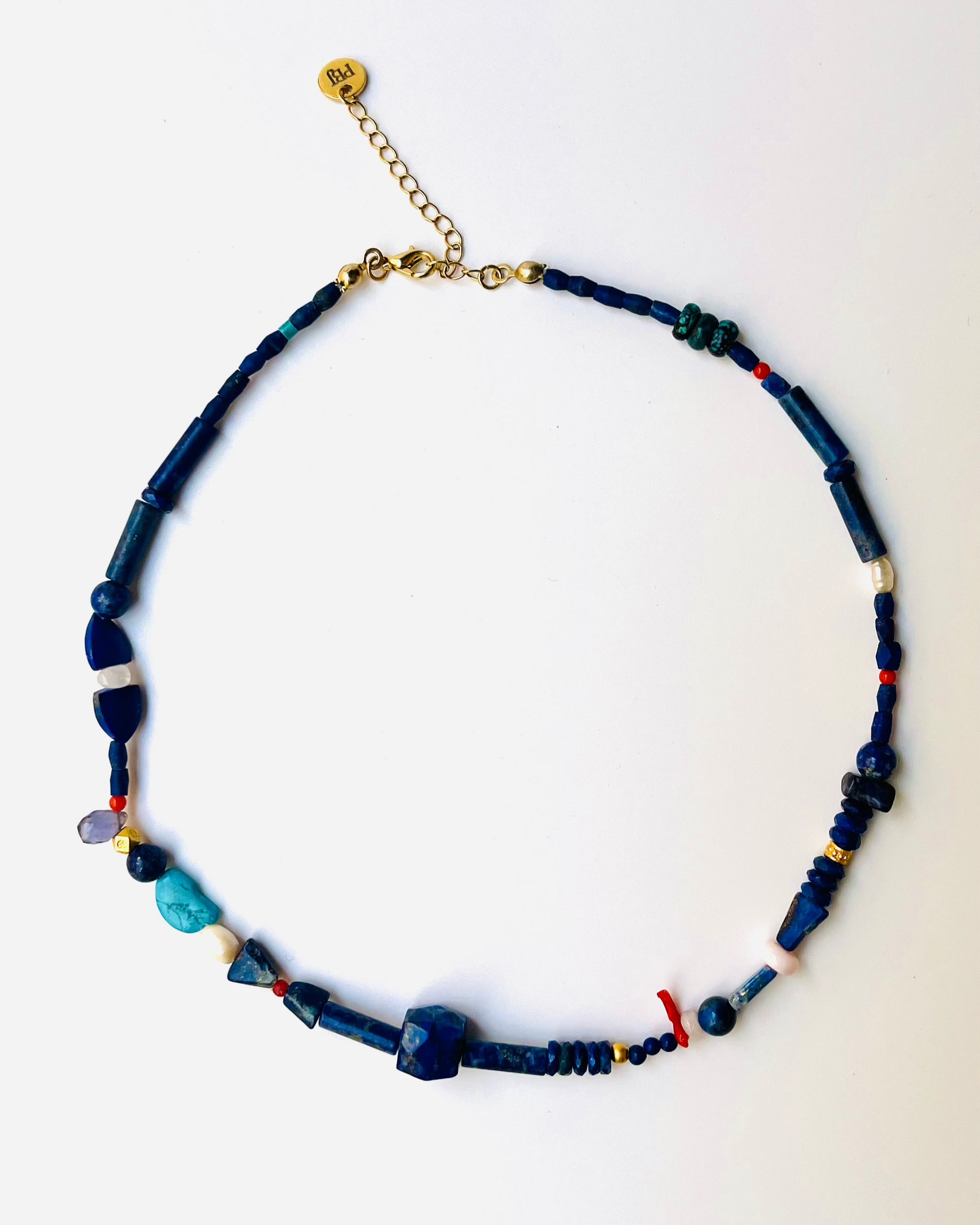 Collar con lapislázuli en distintas tallas, combinado con coral, turquesas, ópalo rosa, iolita, adularia y perla de río.