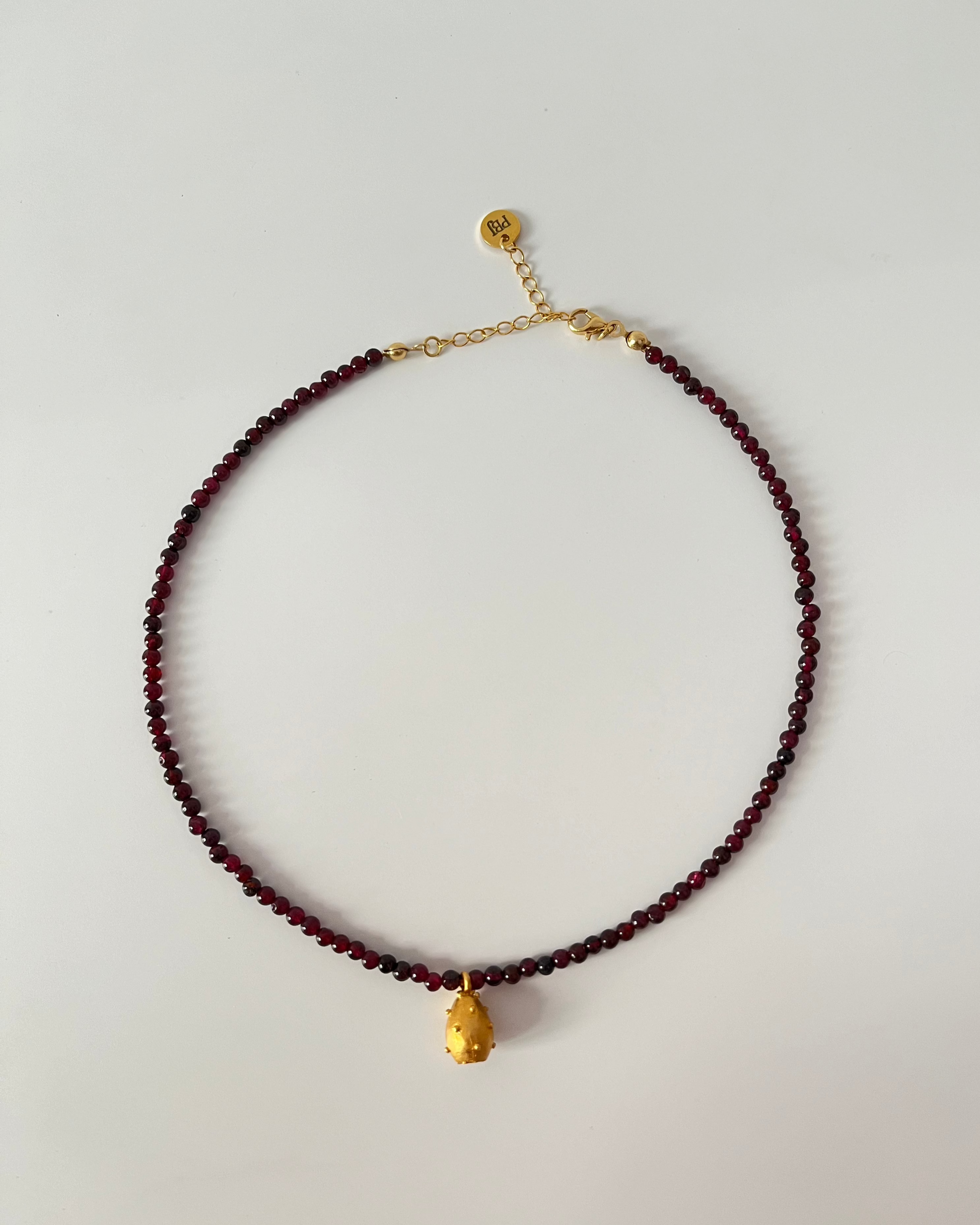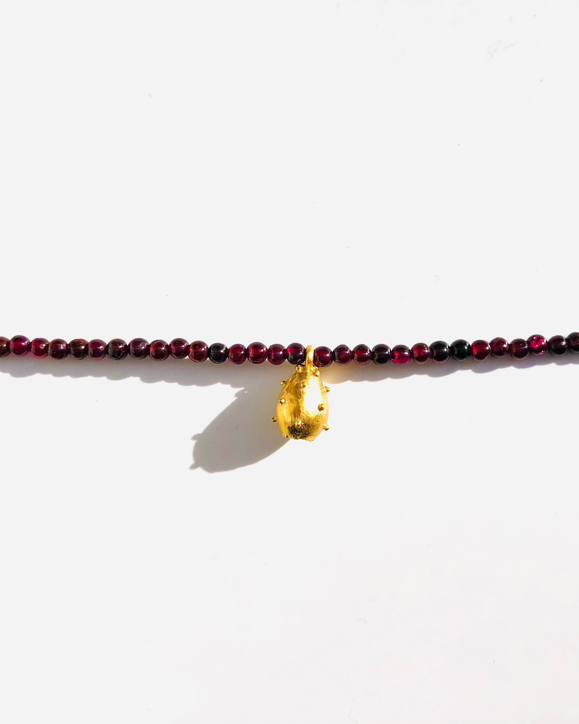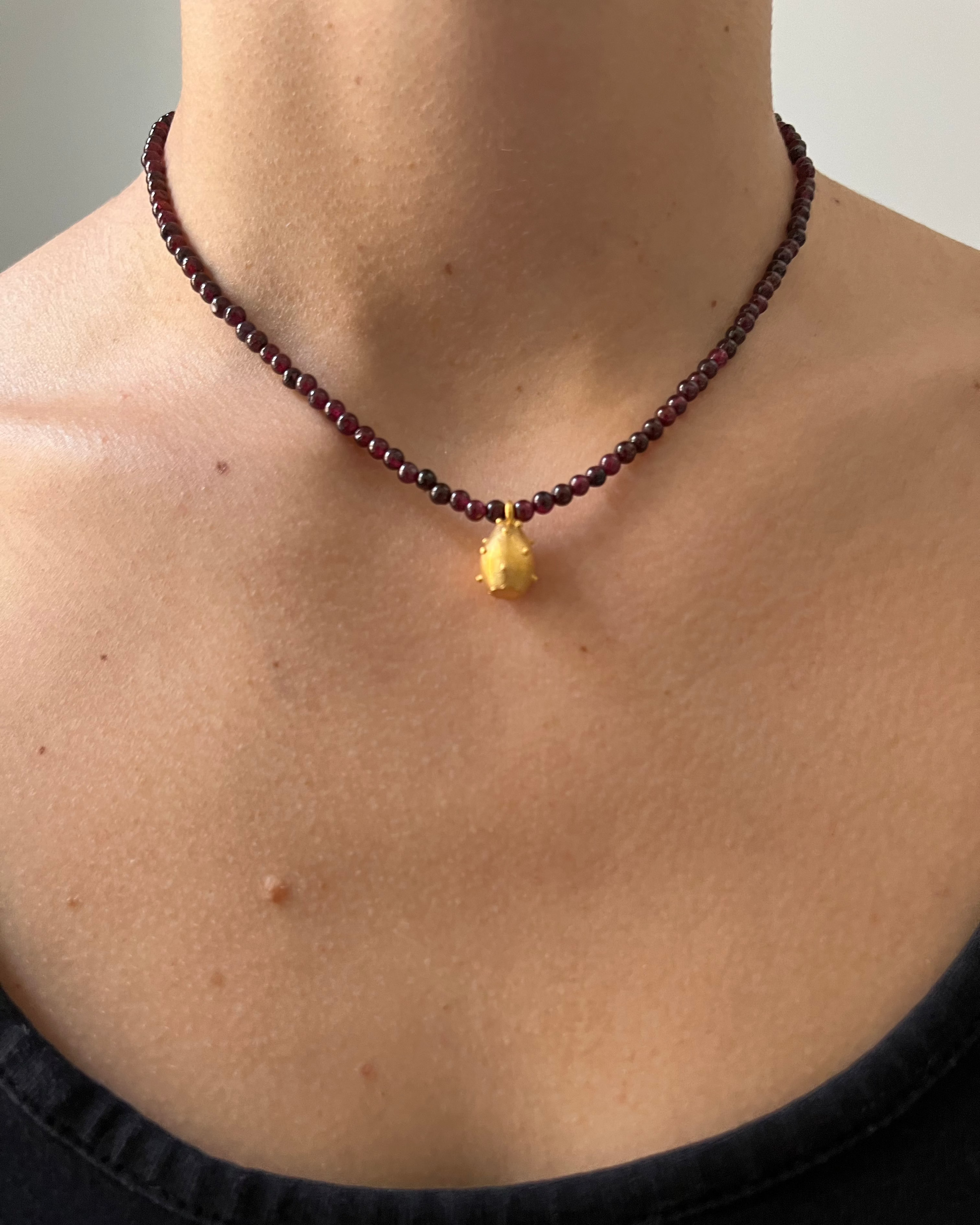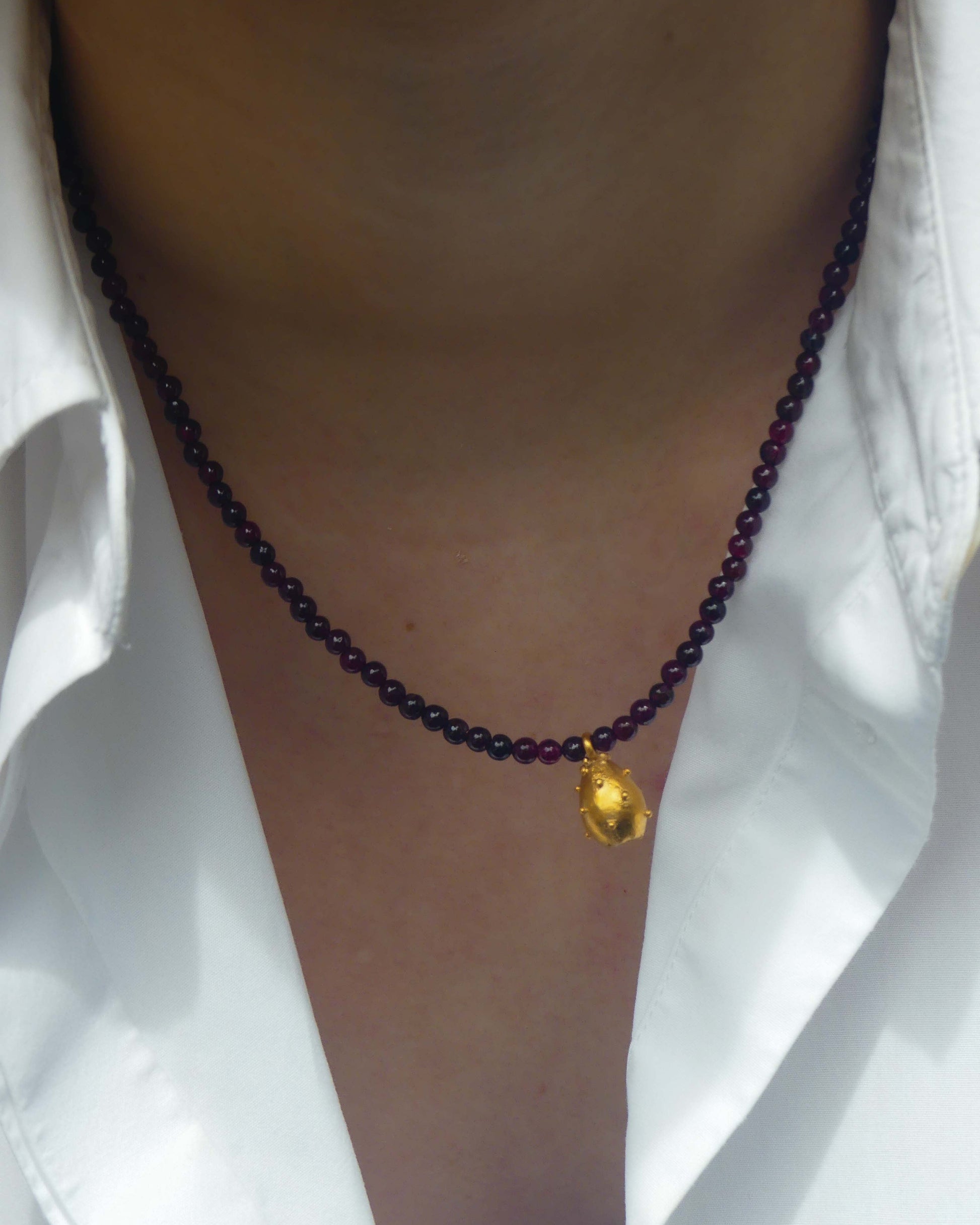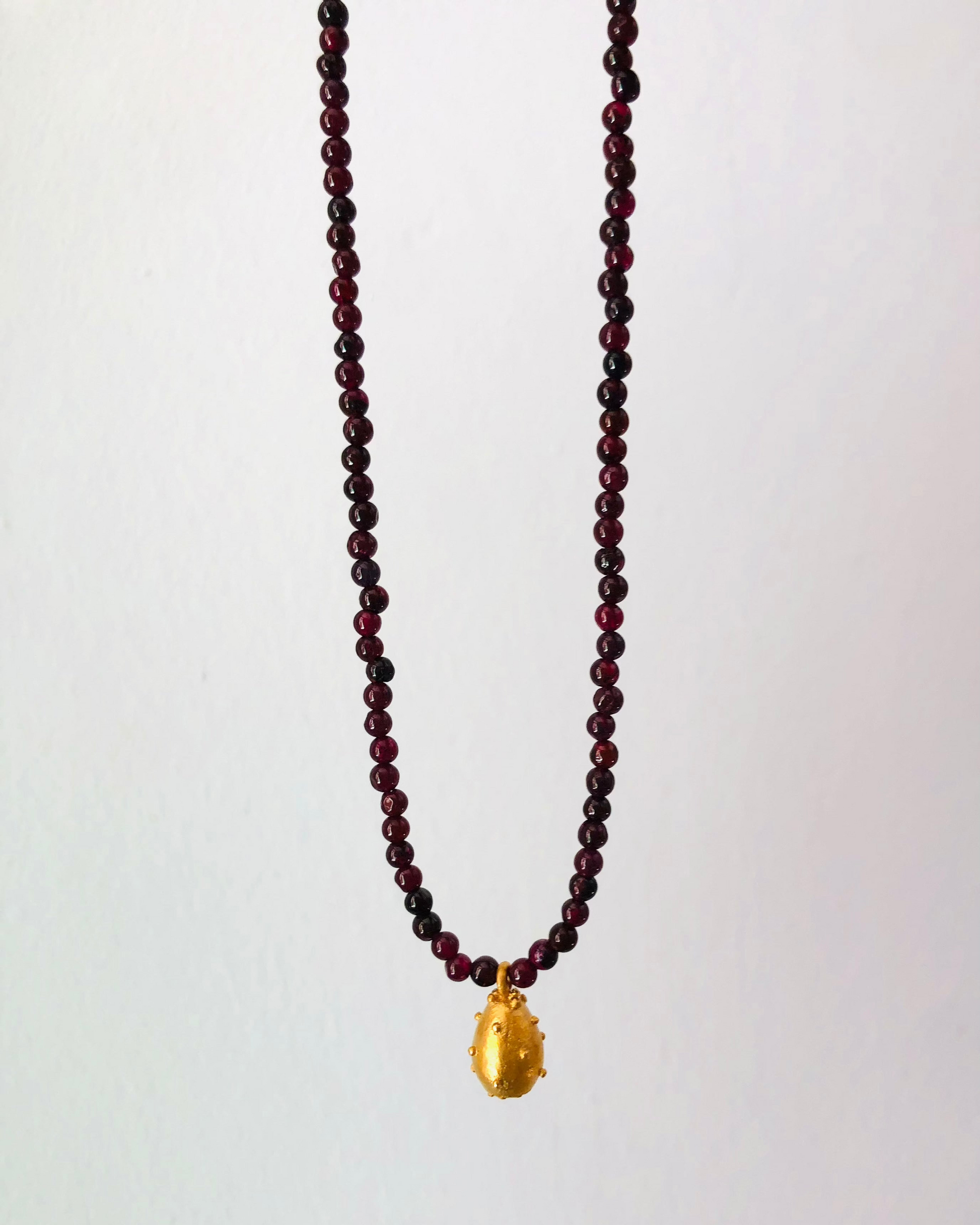 Collar de bolitas de granate natural con el amuleto en forma de higo chumbo, símbolo de fuerza y resistencia.