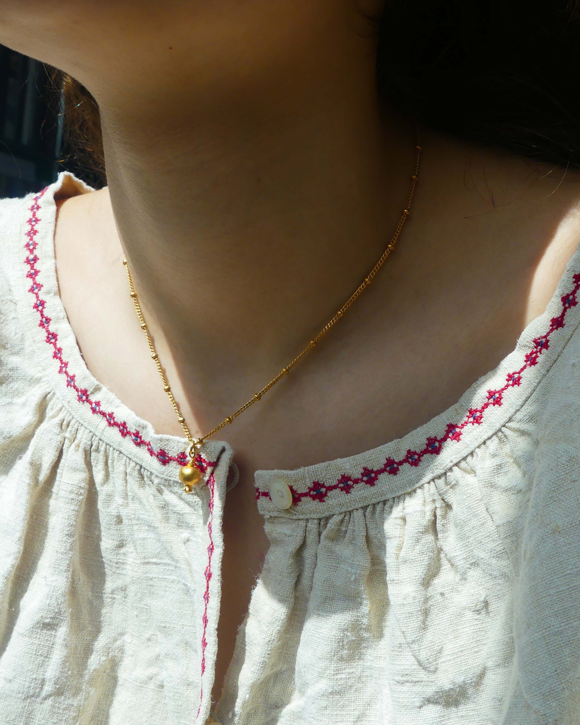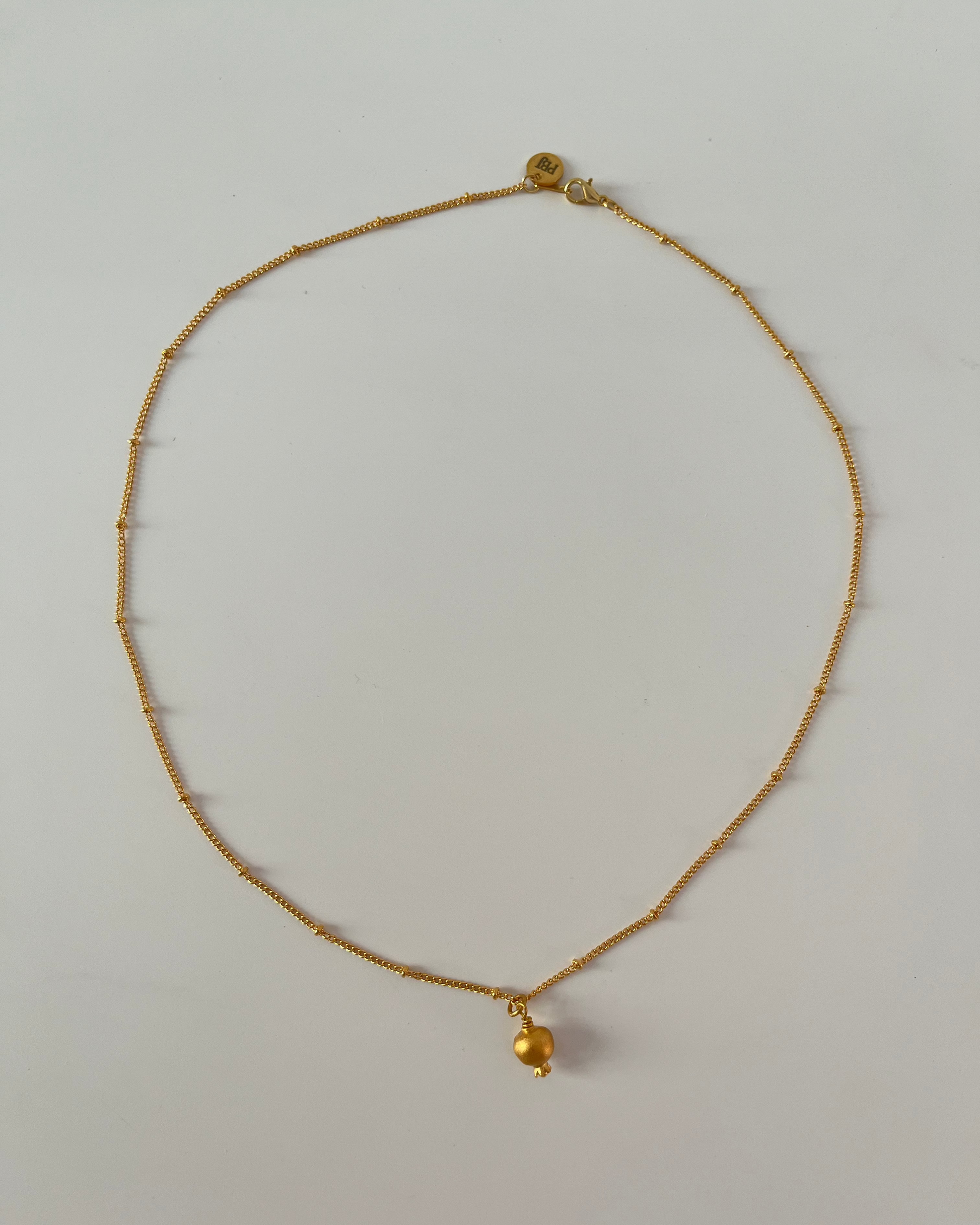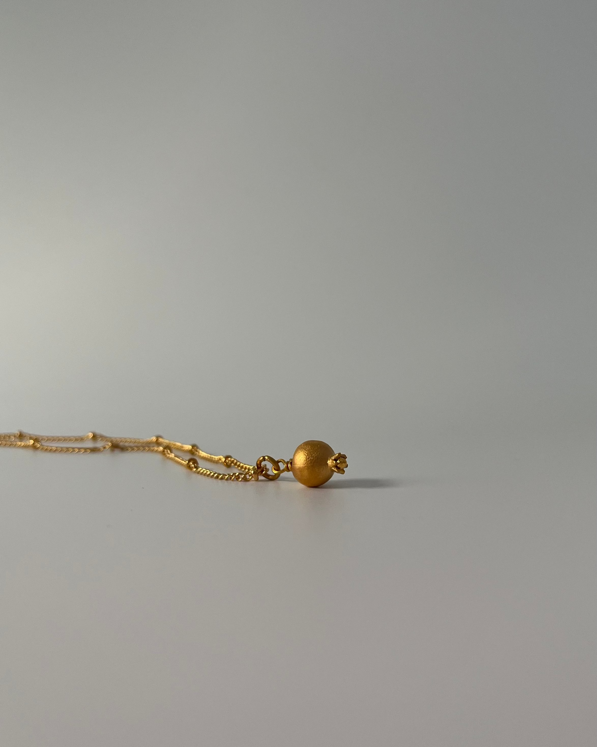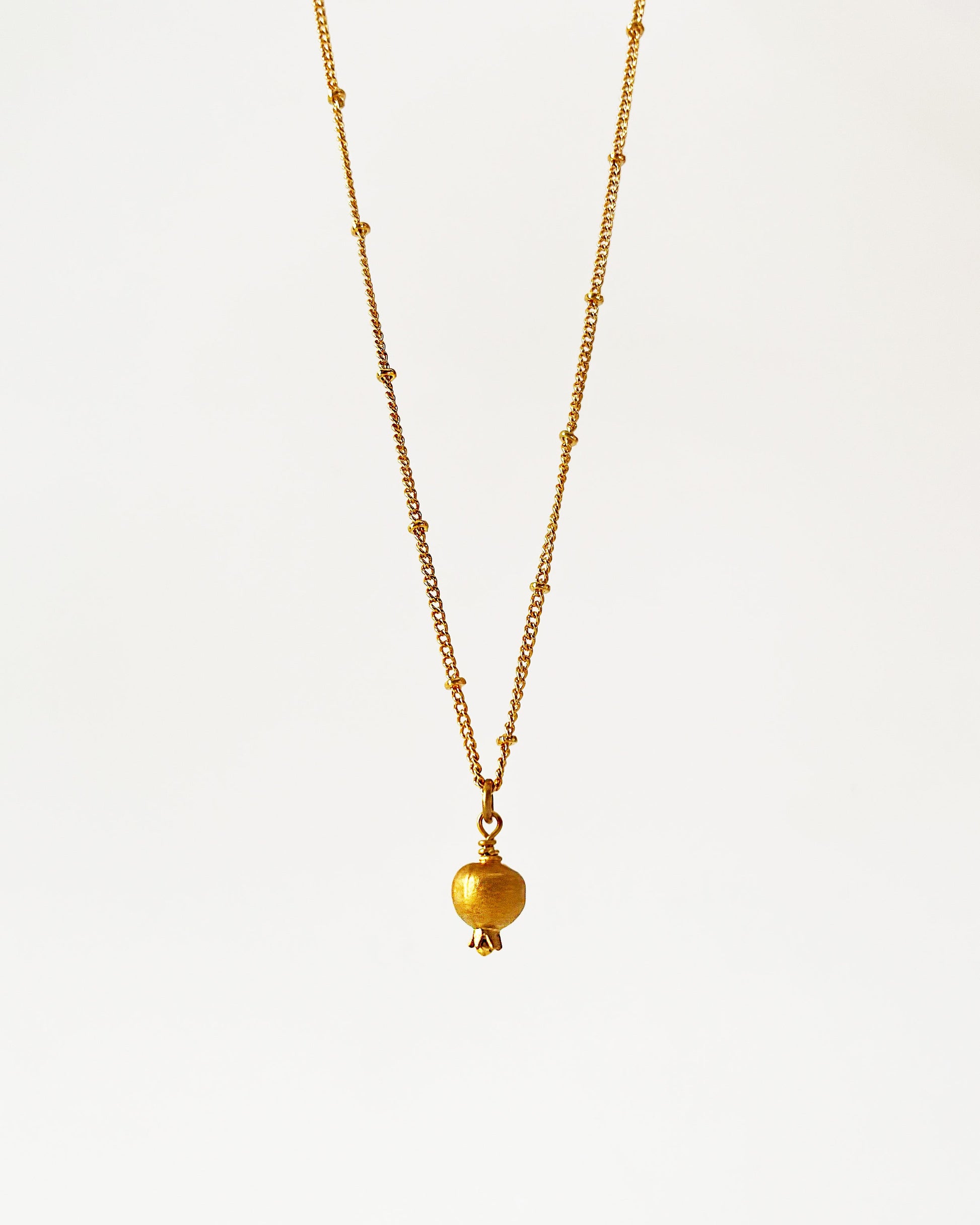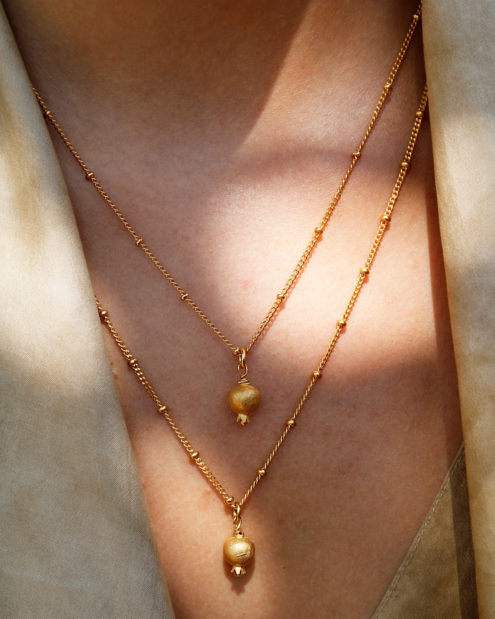 Collar con cadena dorada y el emblemático amuleto de granada, símbolo de abundancia y feminidad.