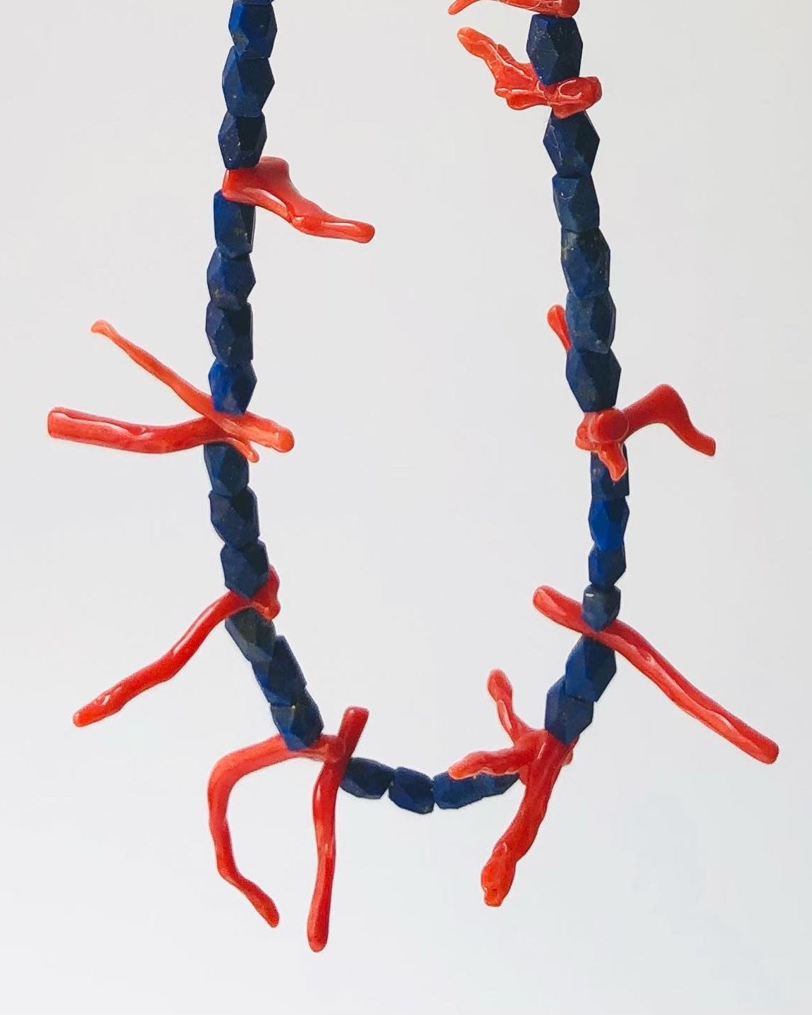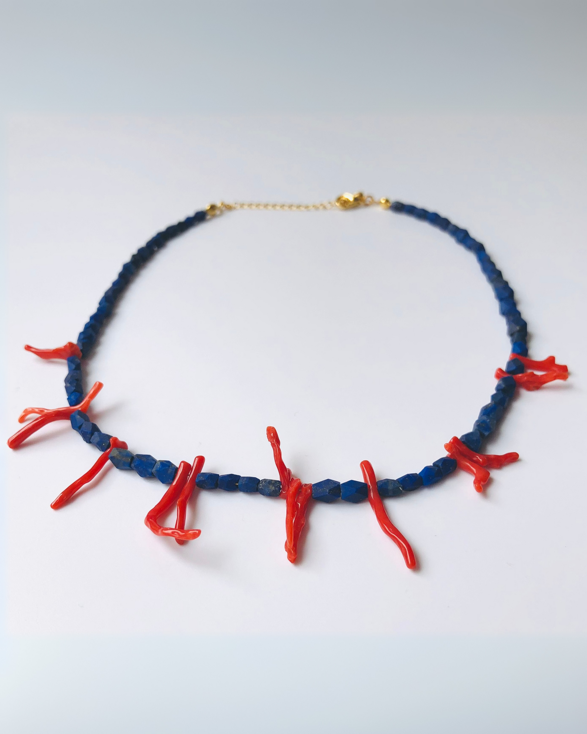 Collar de lapislázuli y ramas de coral rojo mediterráneo, una pieza única de la colección Lapislázuli . El Bazar de Pepa. Serie limitada.