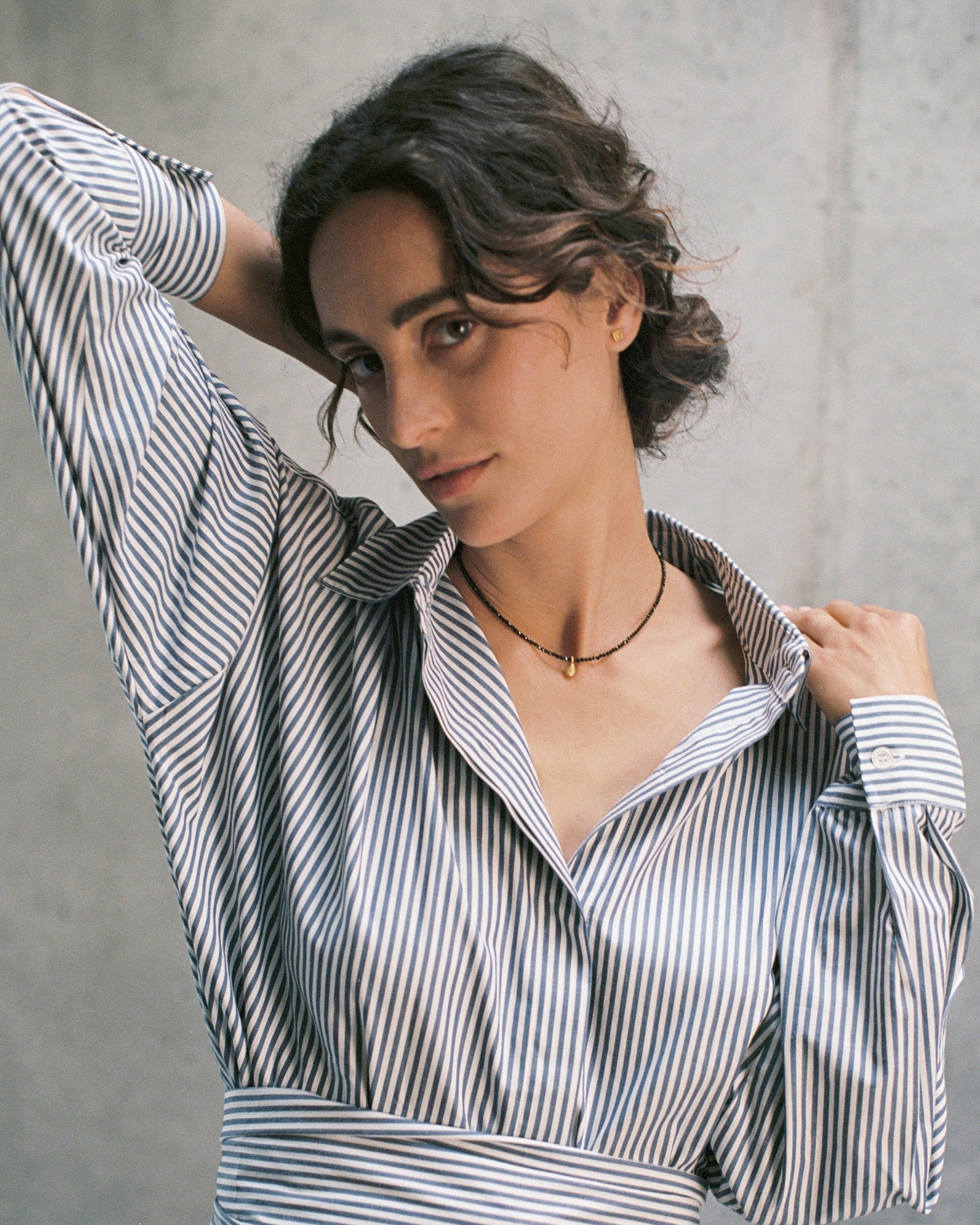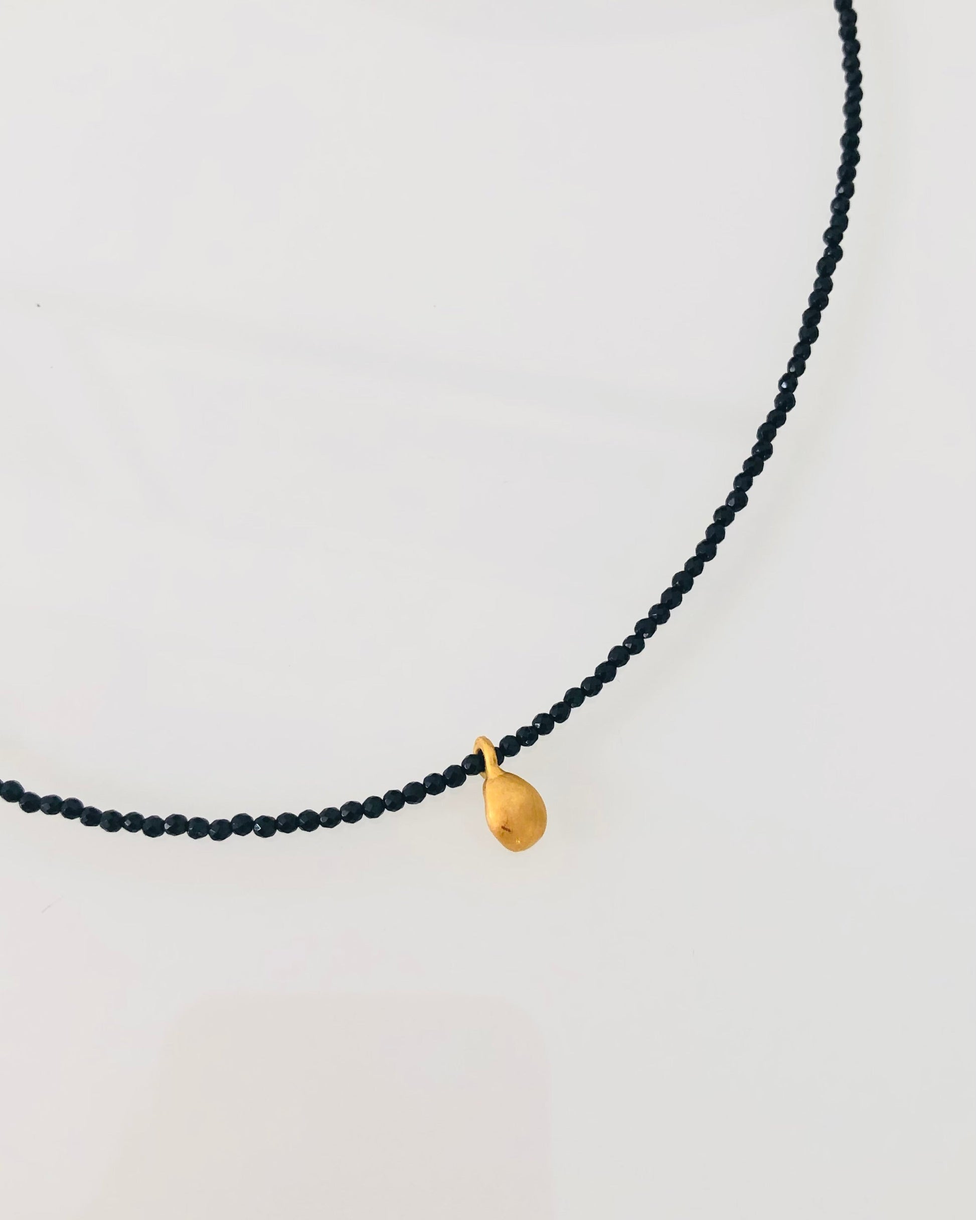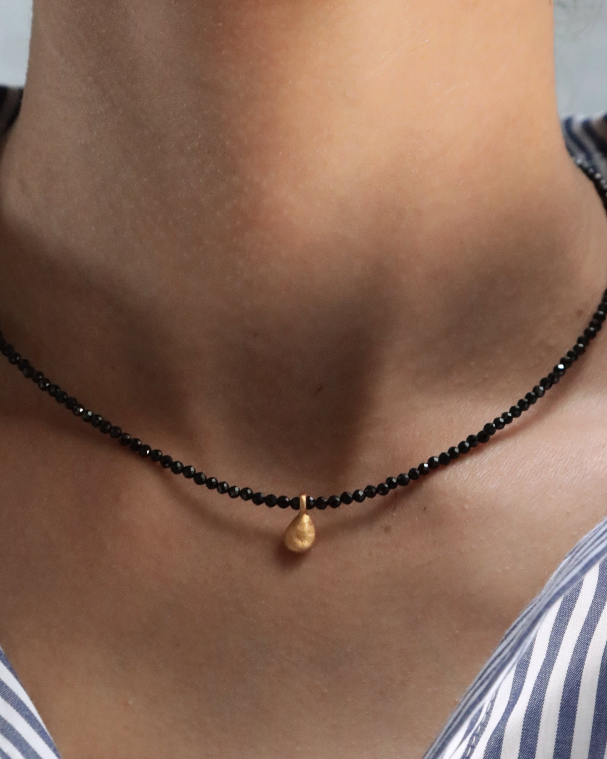 Collar de espinela negra facetada y charm dorado en forma de pepita, una pieza que rinde homenaje a Pepa, abuela y fuente de inspiración de la marca.