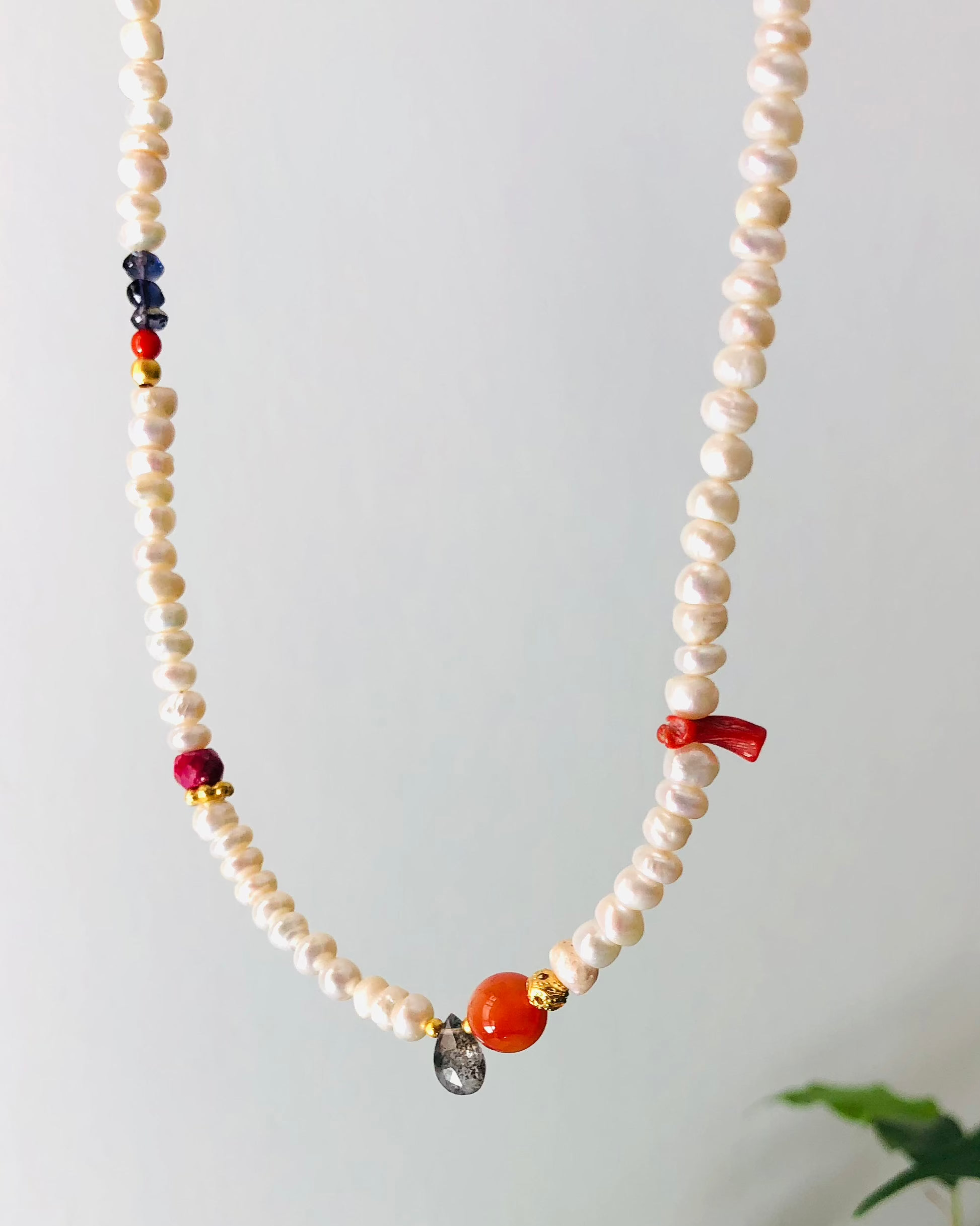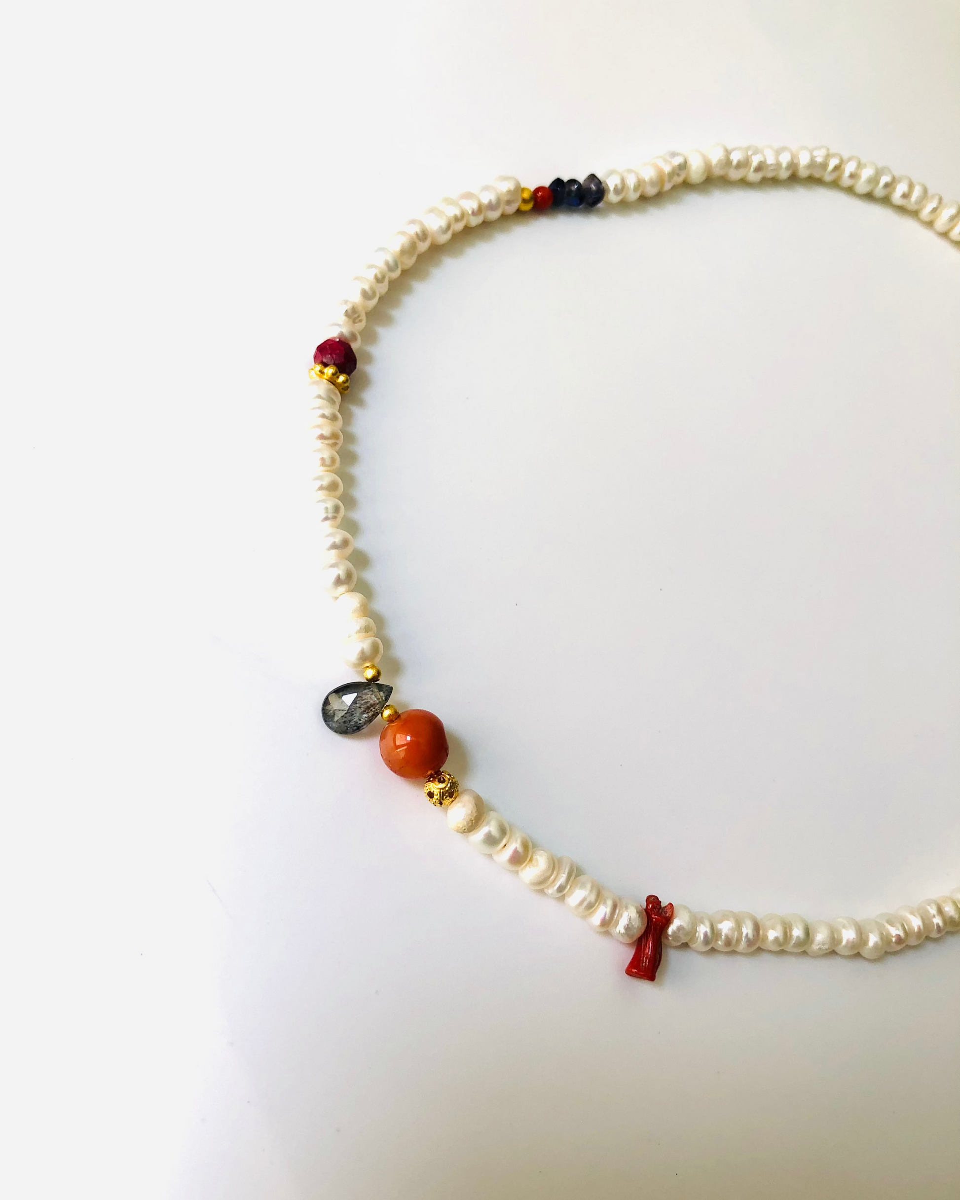 Collar de perlas de río chatas e irregulares, combinadas con una cuidada selección de gemas de distintas formas, colores y procedencias. Nunca he sido de perlas, así que decidí hacer un collar con el que me sintiera a gusto y surgió esta pieza única que celebra la belleza de lo diverso, lo inesperado y me siento yo misma. Espero que también lo sea para ti.