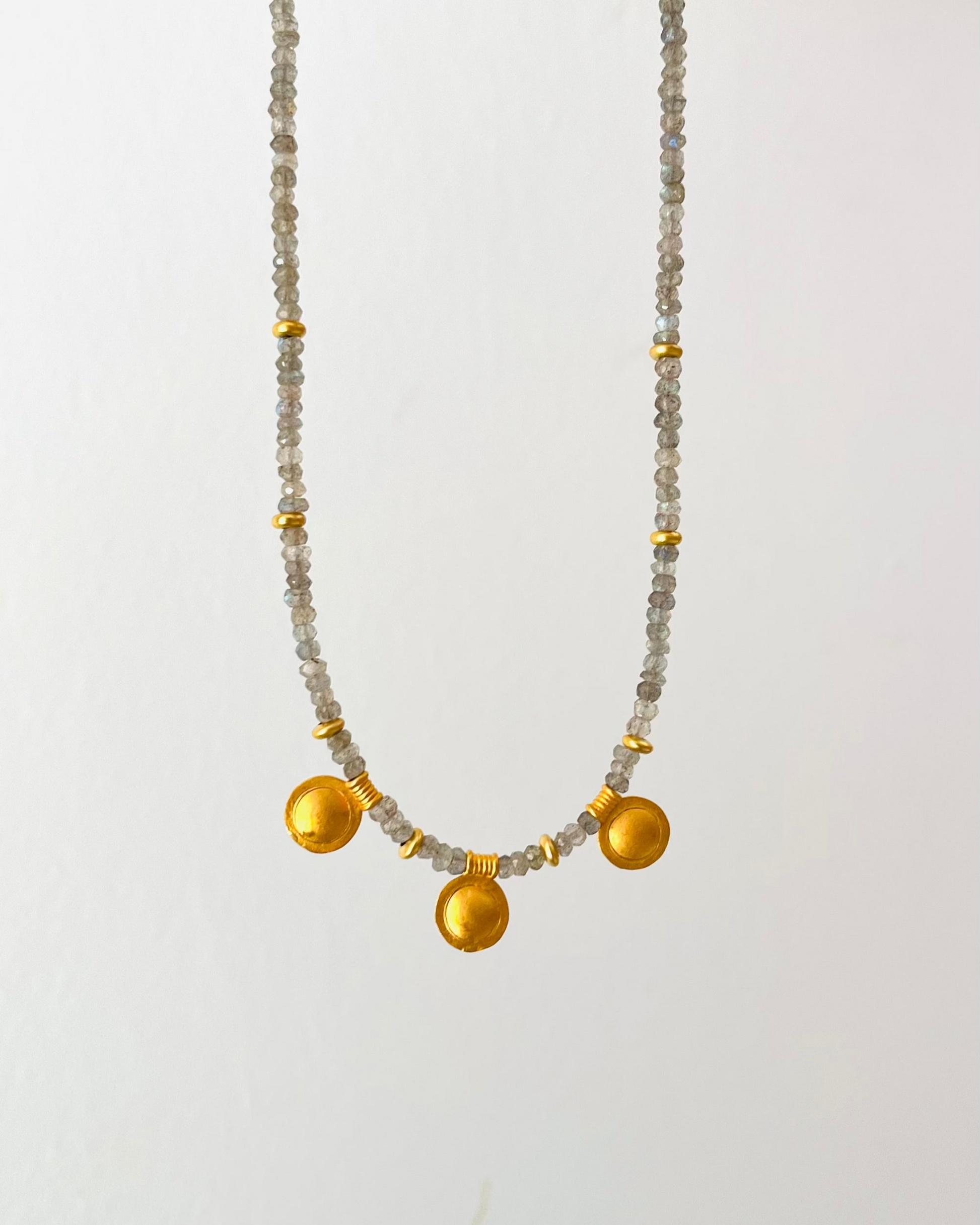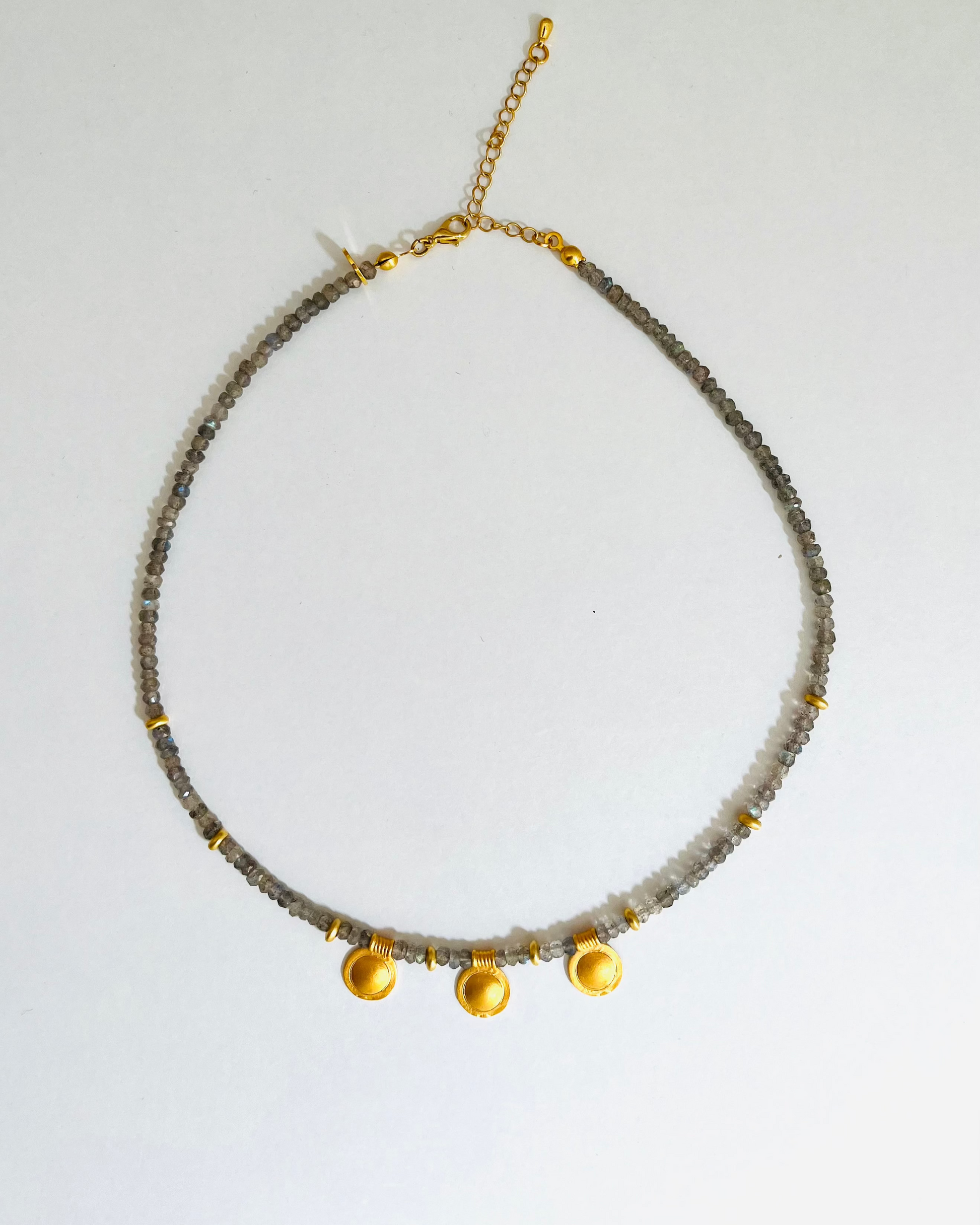 Una composición rica en textura y luz gracias al contraste entre el amarillo oro color 24 kts con el gris irisado de la labradorita facetada, detalles sutiles, diseño evocador de un collar del Mediterráneo Antiguo.