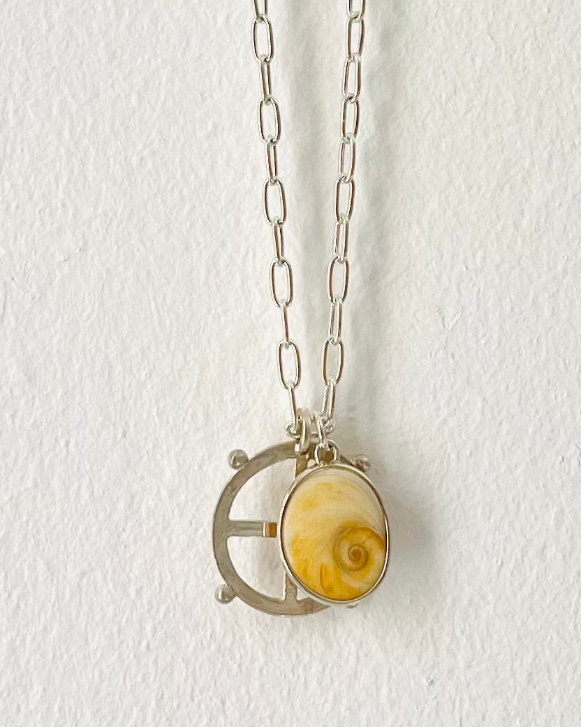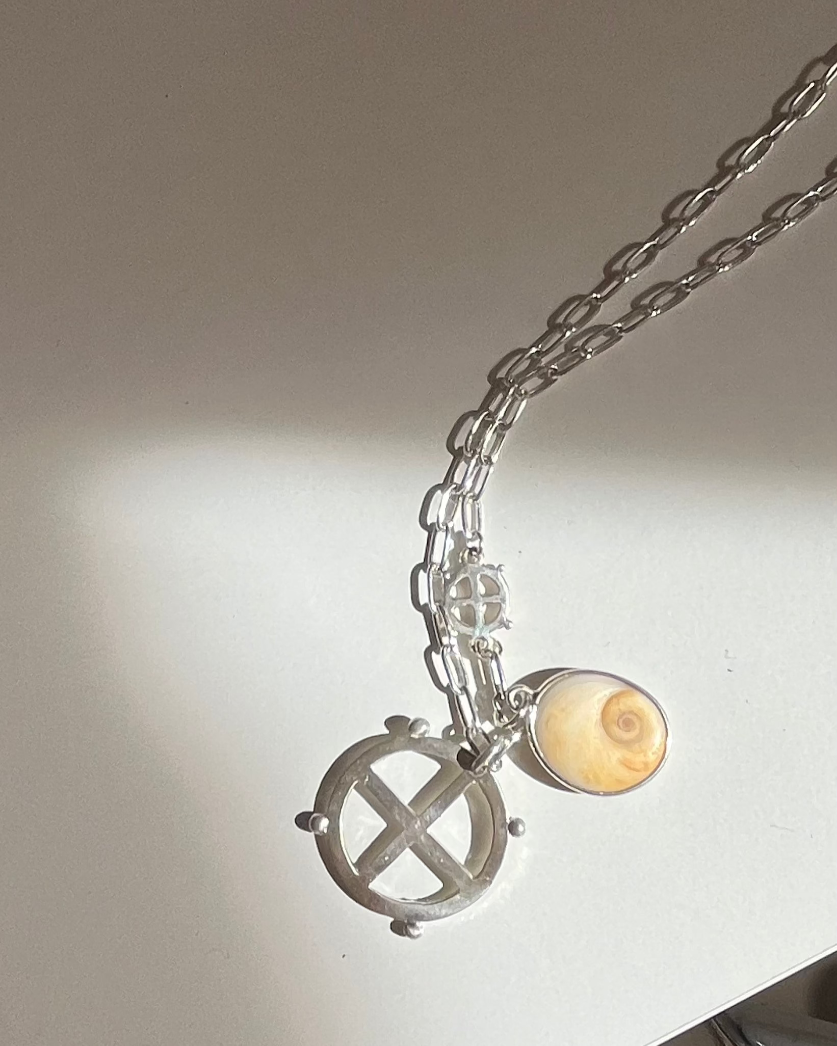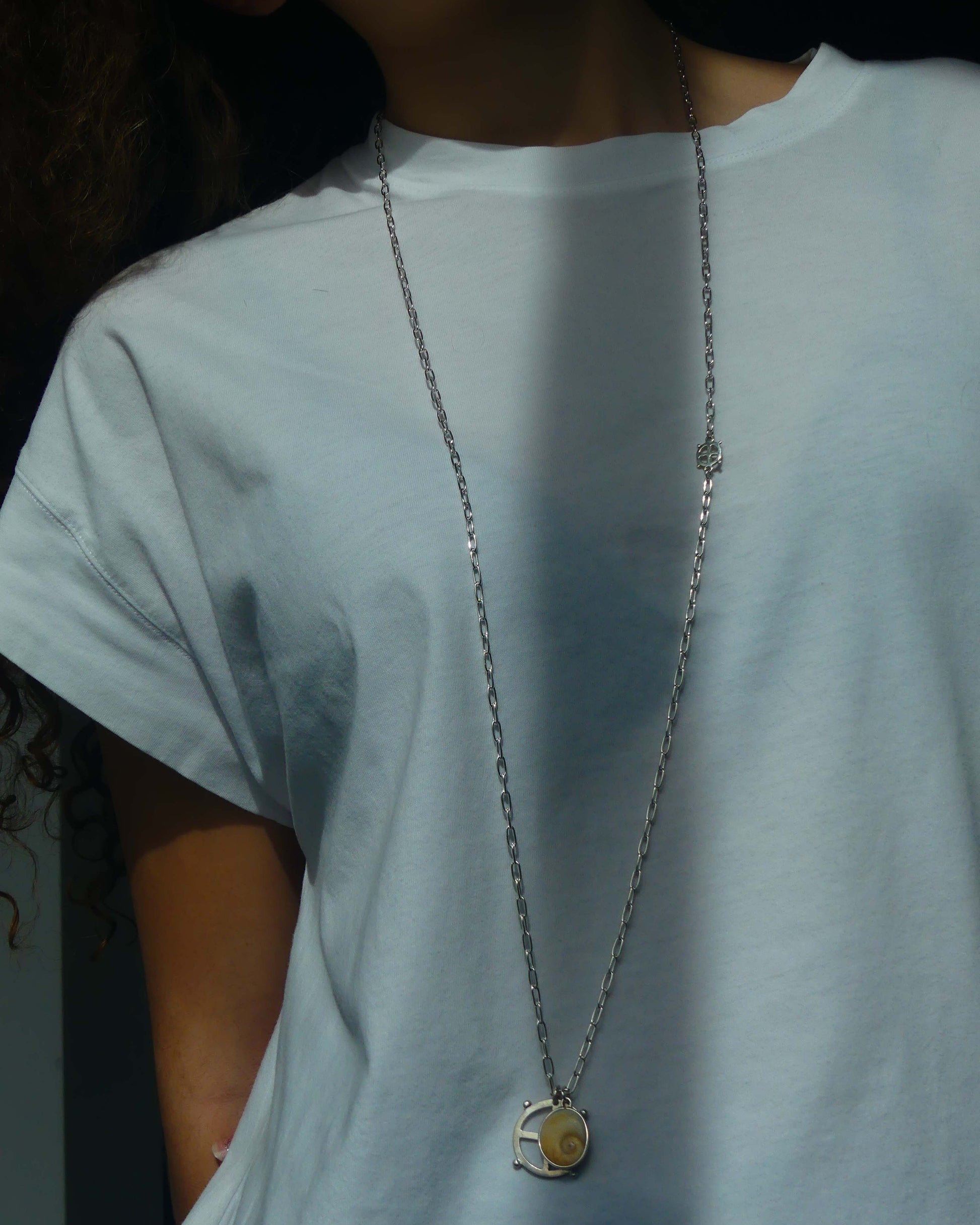 Collar extra largo con piedra Santa Lucía natural y el logo de la marca como charms protagonistas. En Mallorca nos gusta mucho este amuleto llamado piedra de Santa Lucía, dicen que es protector de la vista. este en concreto es de gran tamaño y procede de las playas del Atlántico de Tanger.