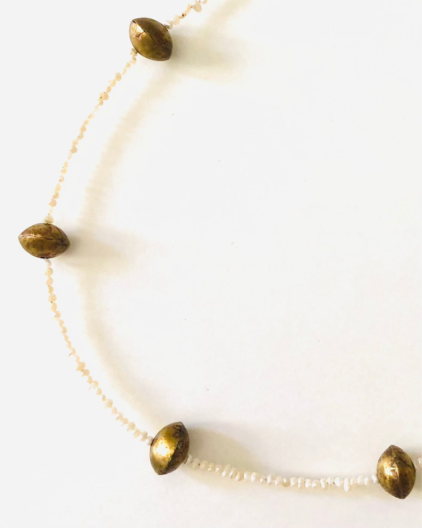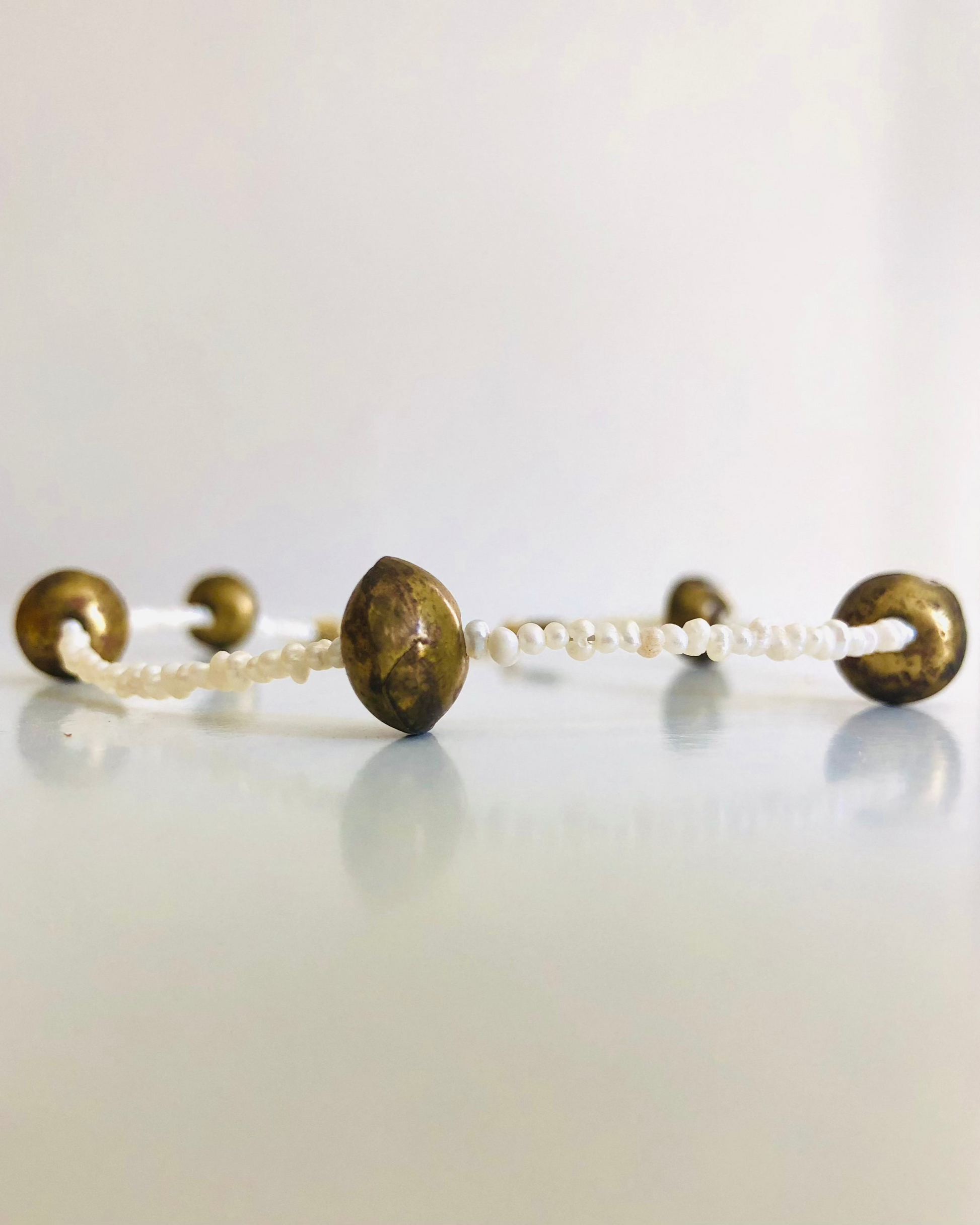 Perlas de rio de 2mm y piezas vintage en latón procedentes de Ghana.