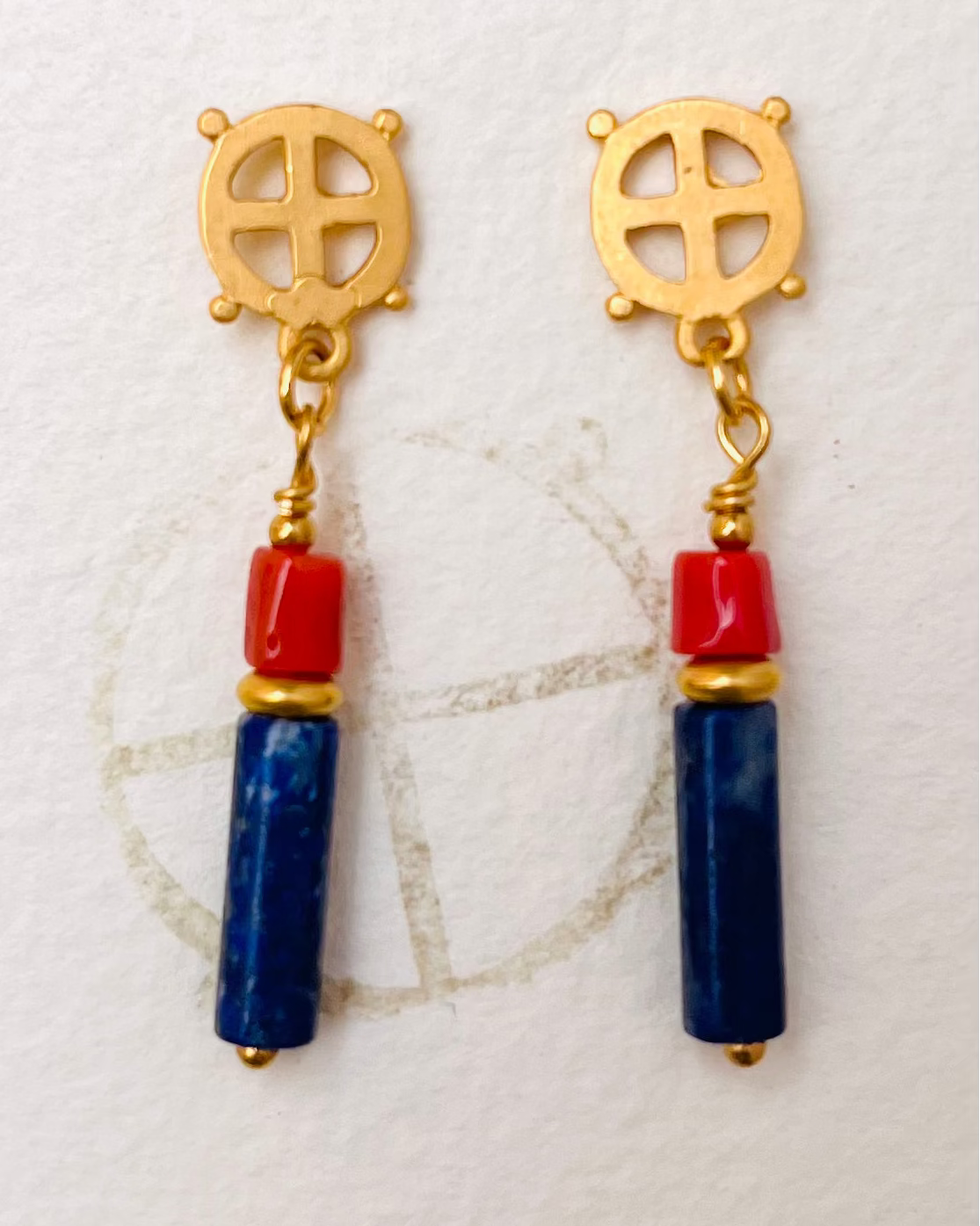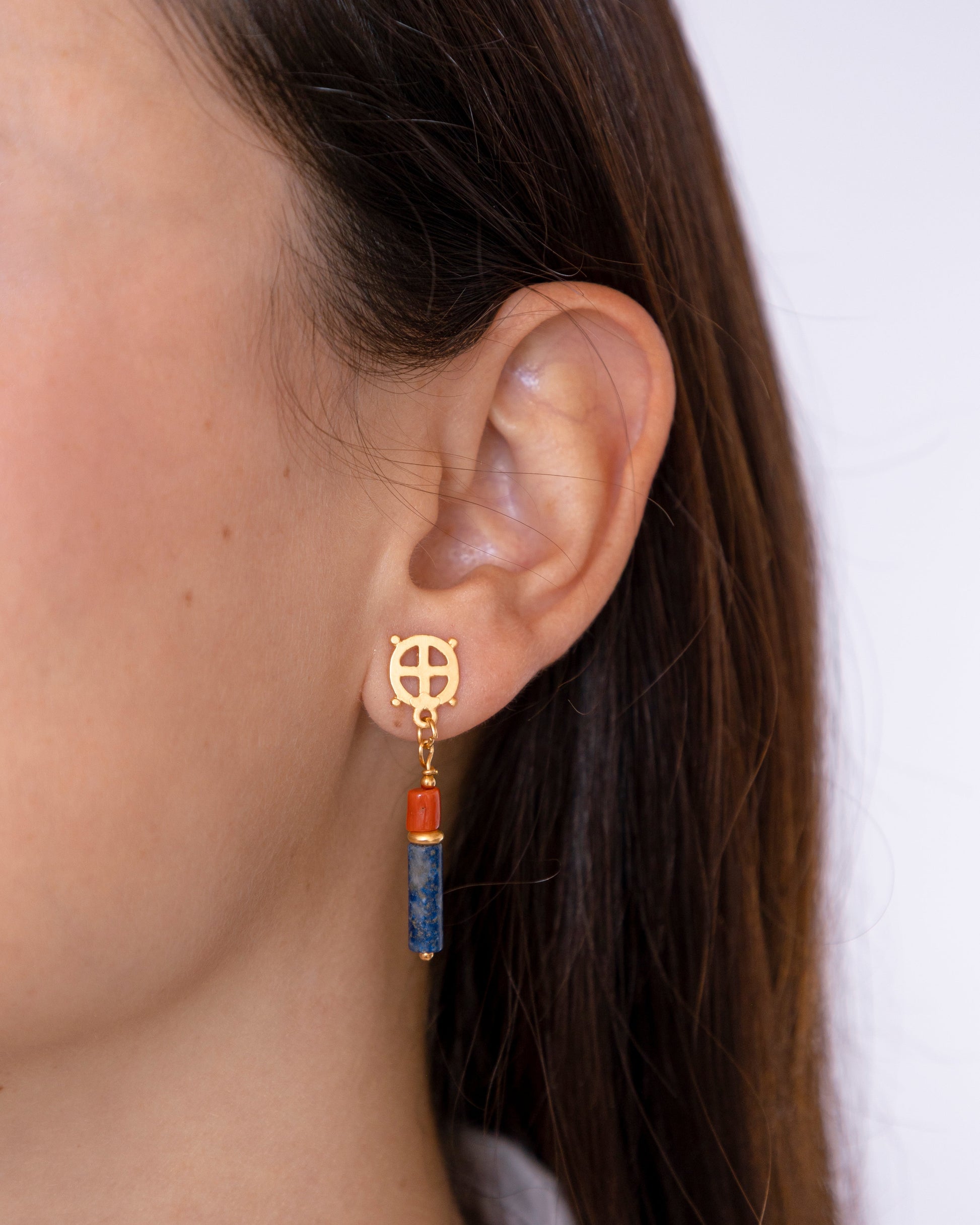 Pendientes largos combinados con coral y lapislázuli, el logo de la marca aparece en la parte superior realizando la función de sujeción del pendiente con cierre a presión.